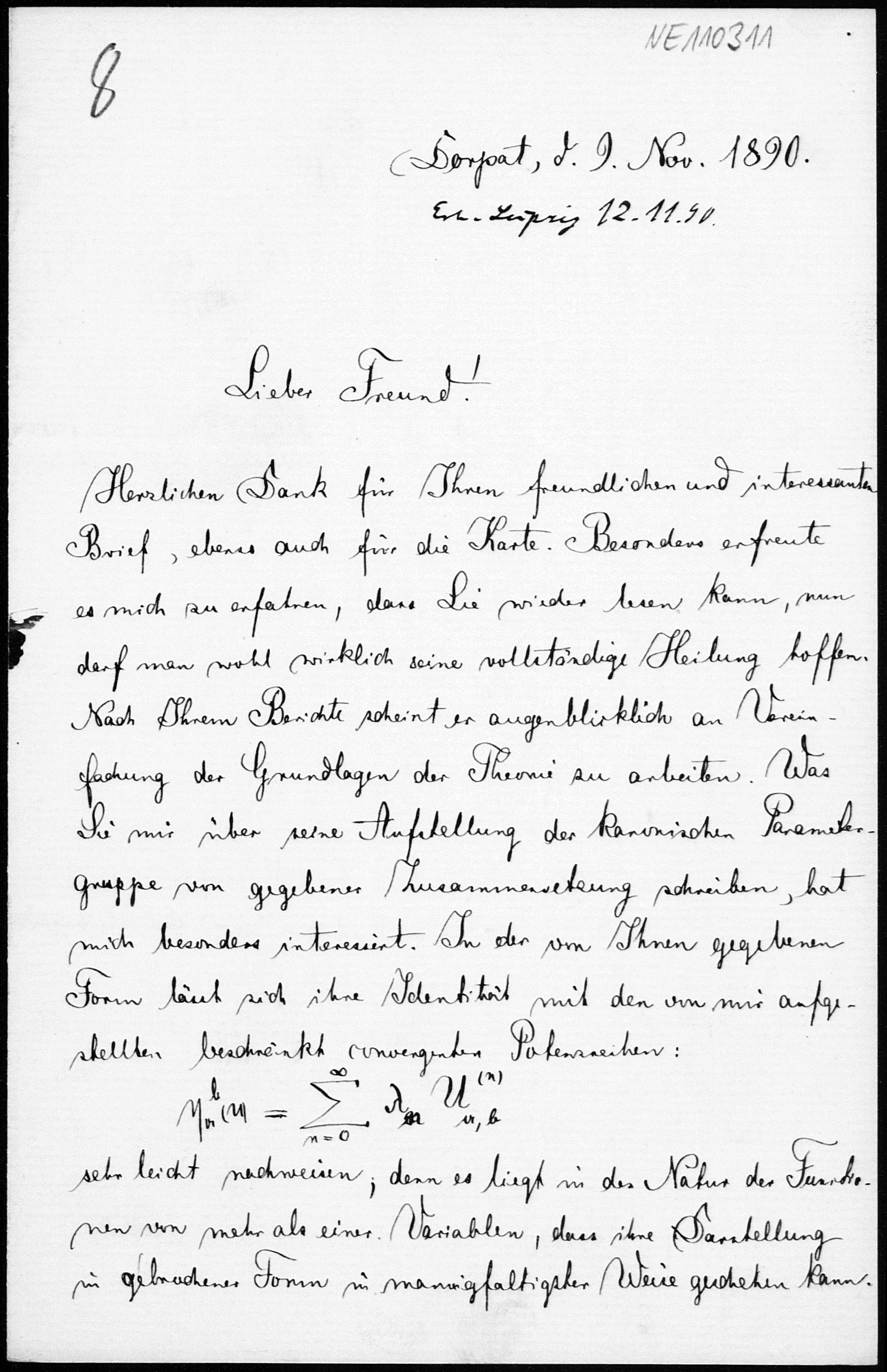 Brief von Friedrich Schur an Friedrich Engel vom 9.11.1890