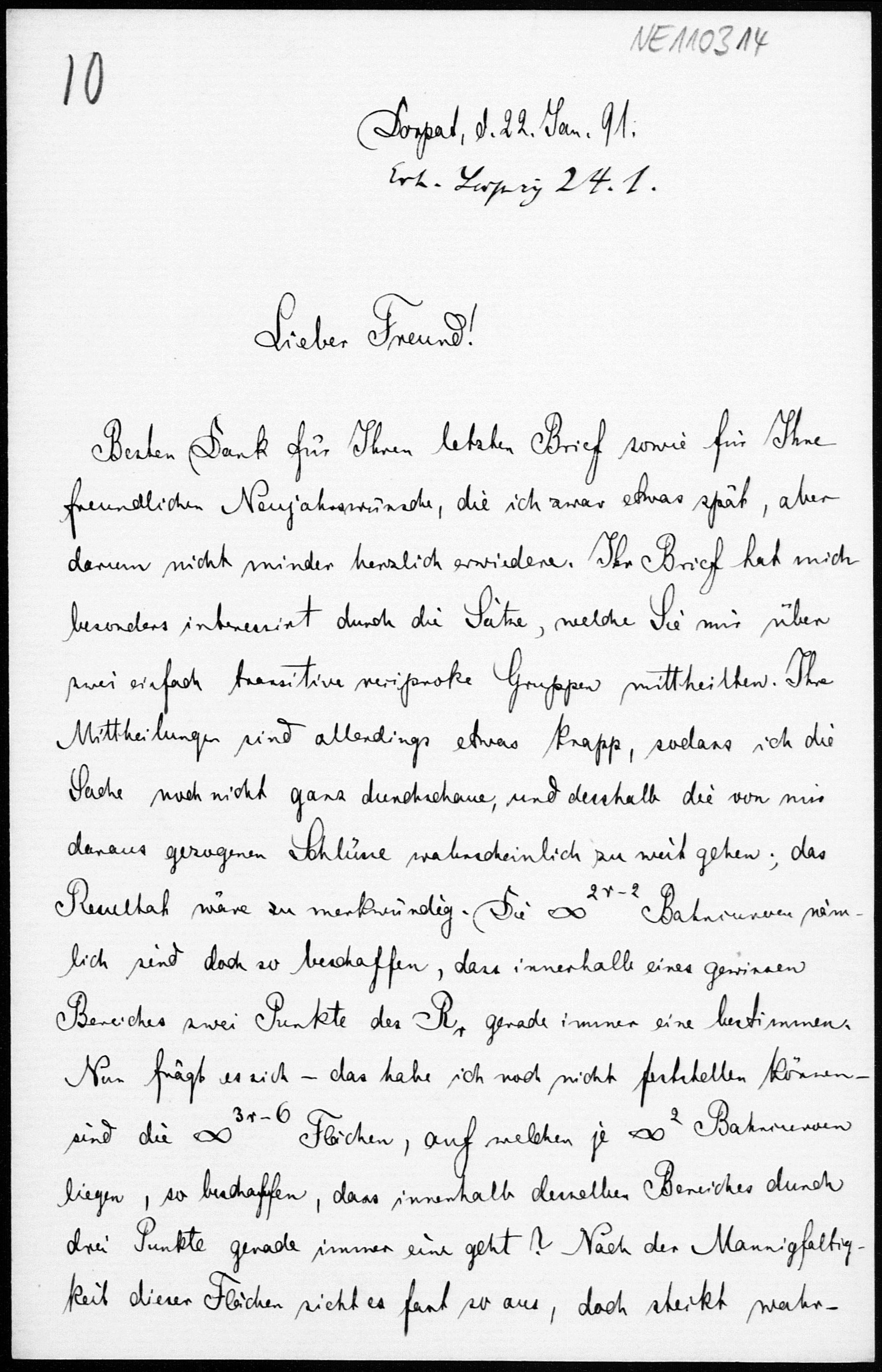 Brief von Friedrich Schur an Friedrich Engel vom 22.1.1891
