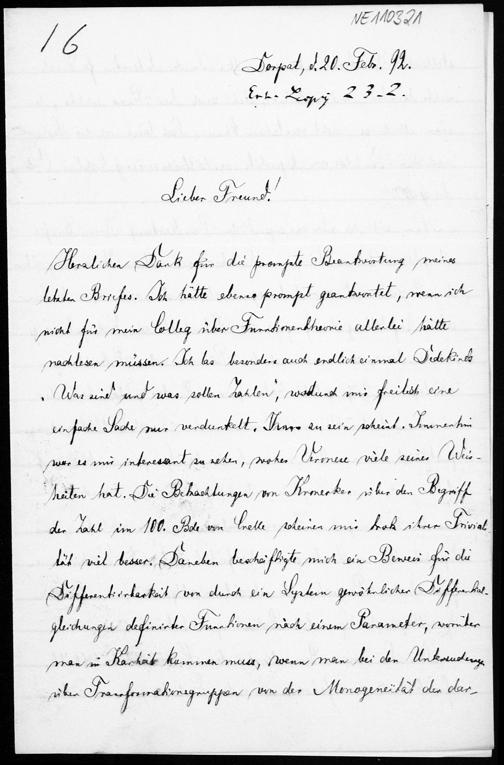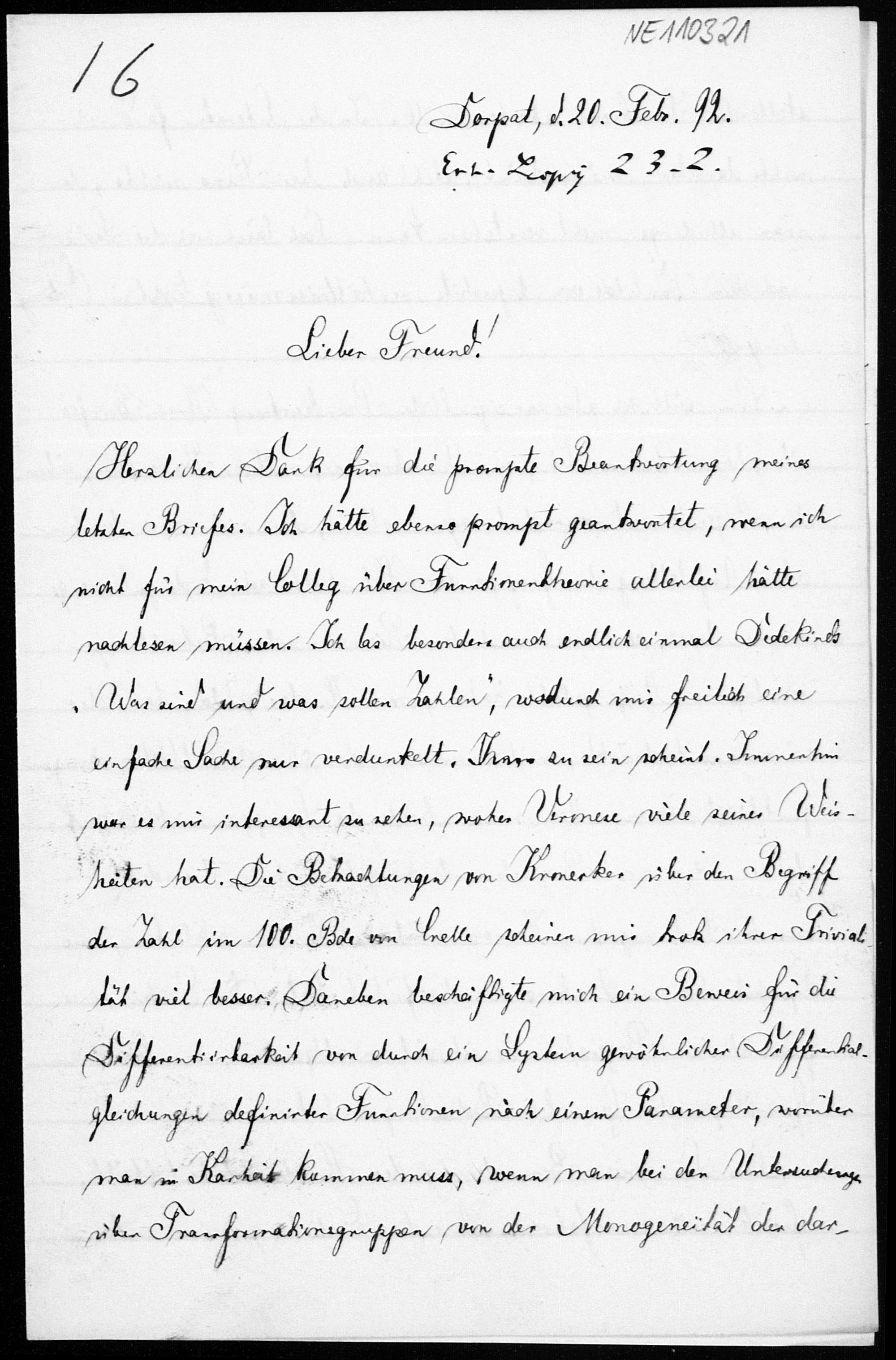 Brief von Friedrich Schur an Friedrich Engel vom 20.2.1892