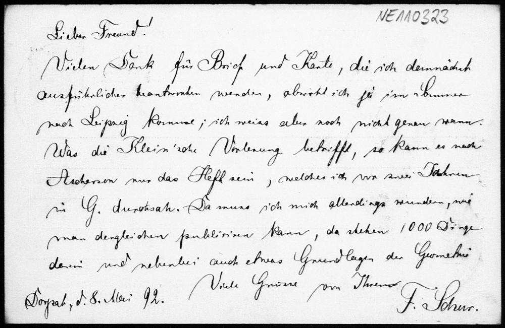 Postkarte von Friedrich Schur an Friedrich Engel vom 8.5.1892