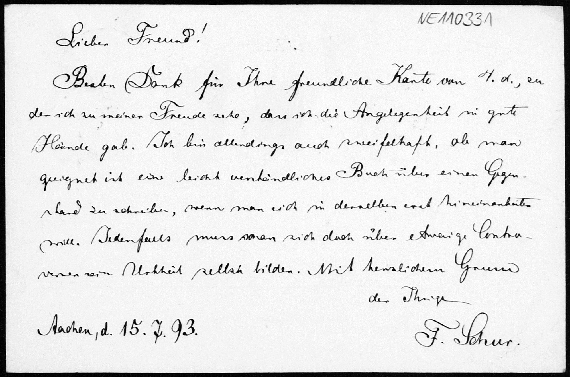 Postkarte von Friedrich Schur an Friedrich Engel vom 15.7.1893