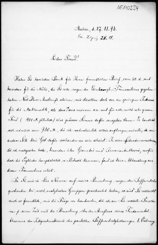 Brief von Friedrich Schur an Friedrich Engel vom 27.11.1893