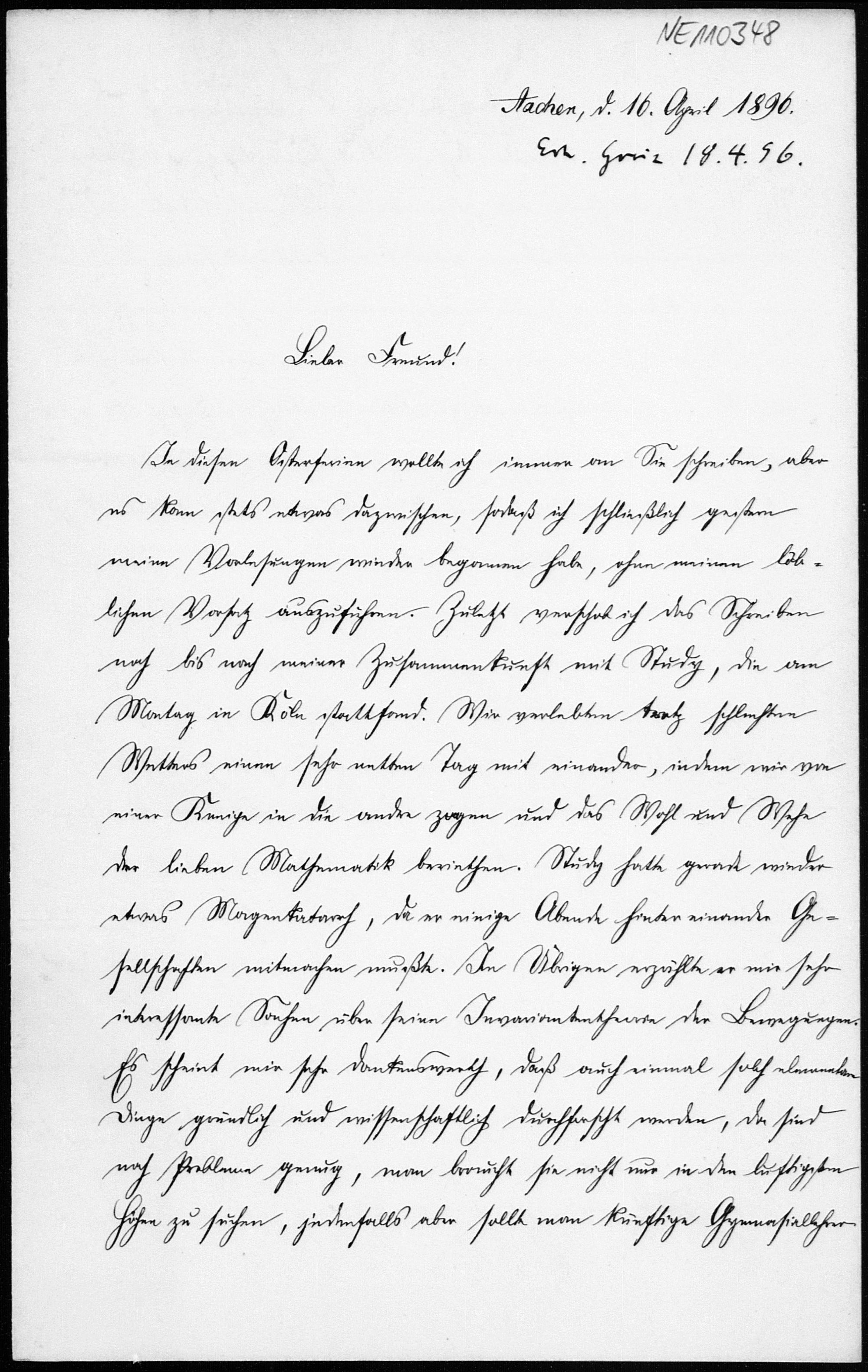 Brief von Friedrich Schur an Friedrich Engel vom 16.4.1896