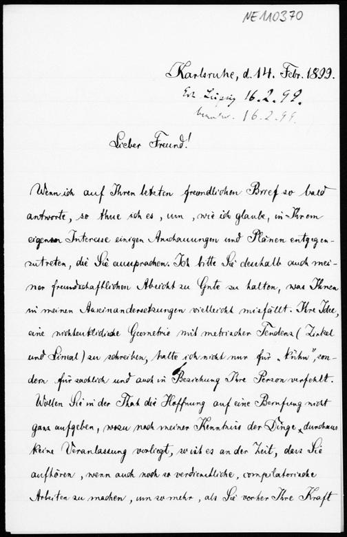 Brief von Friedrich Schur an Friedrich Engel vom 14.2.1899