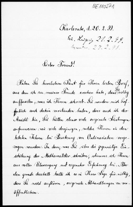 Brief von Friedrich Schur an Friedrich Engel vom 20.2.1899