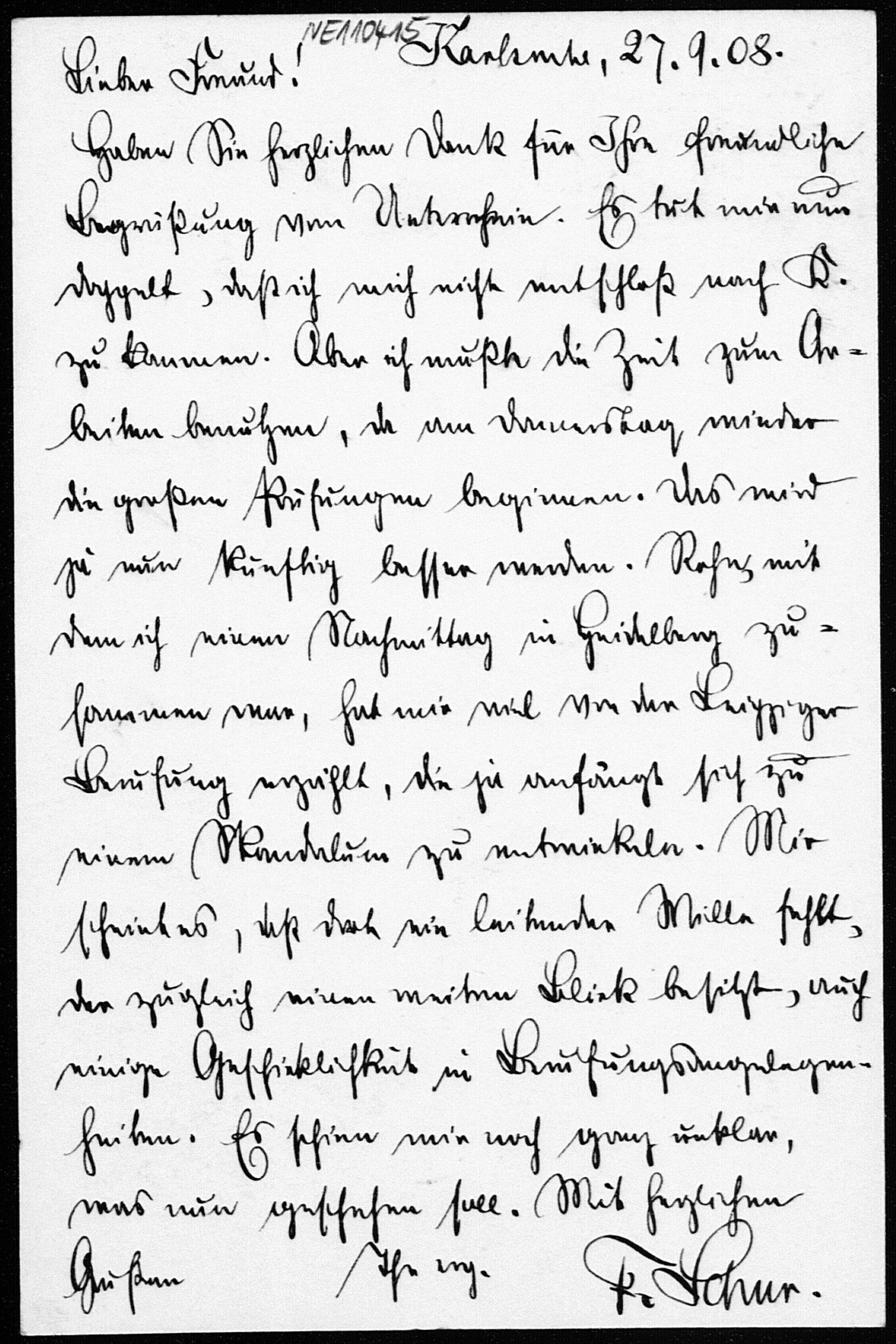Postkarte von Friedrich Schur an Friedrich Engel vom 27.9.1908