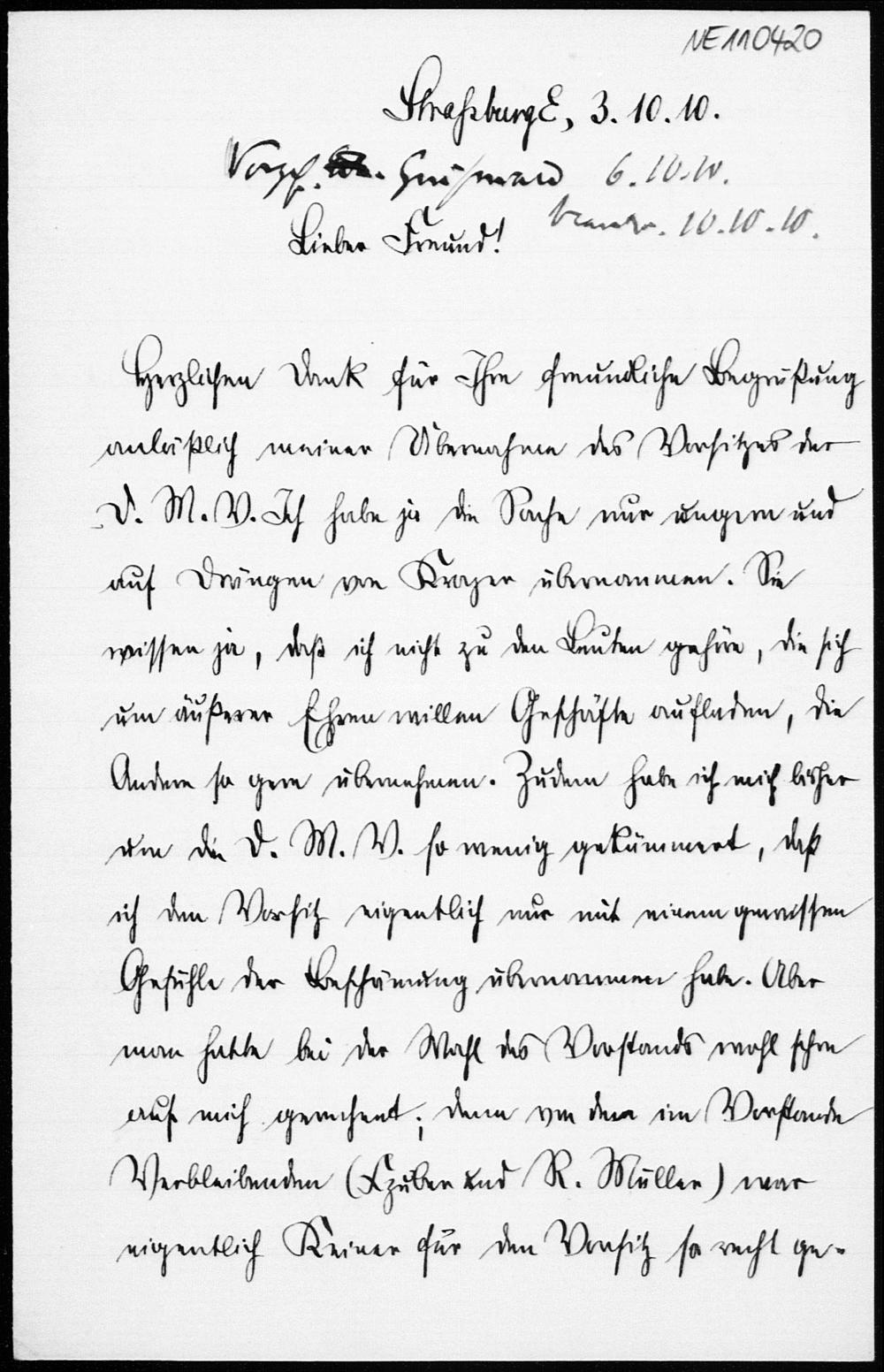 Brief von Friedrich Schur an Friedrich Engel vom 3.10.1910