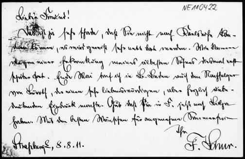 Postkarte von Friedrich Schur an Friedrich Engel vom 8.8.1911