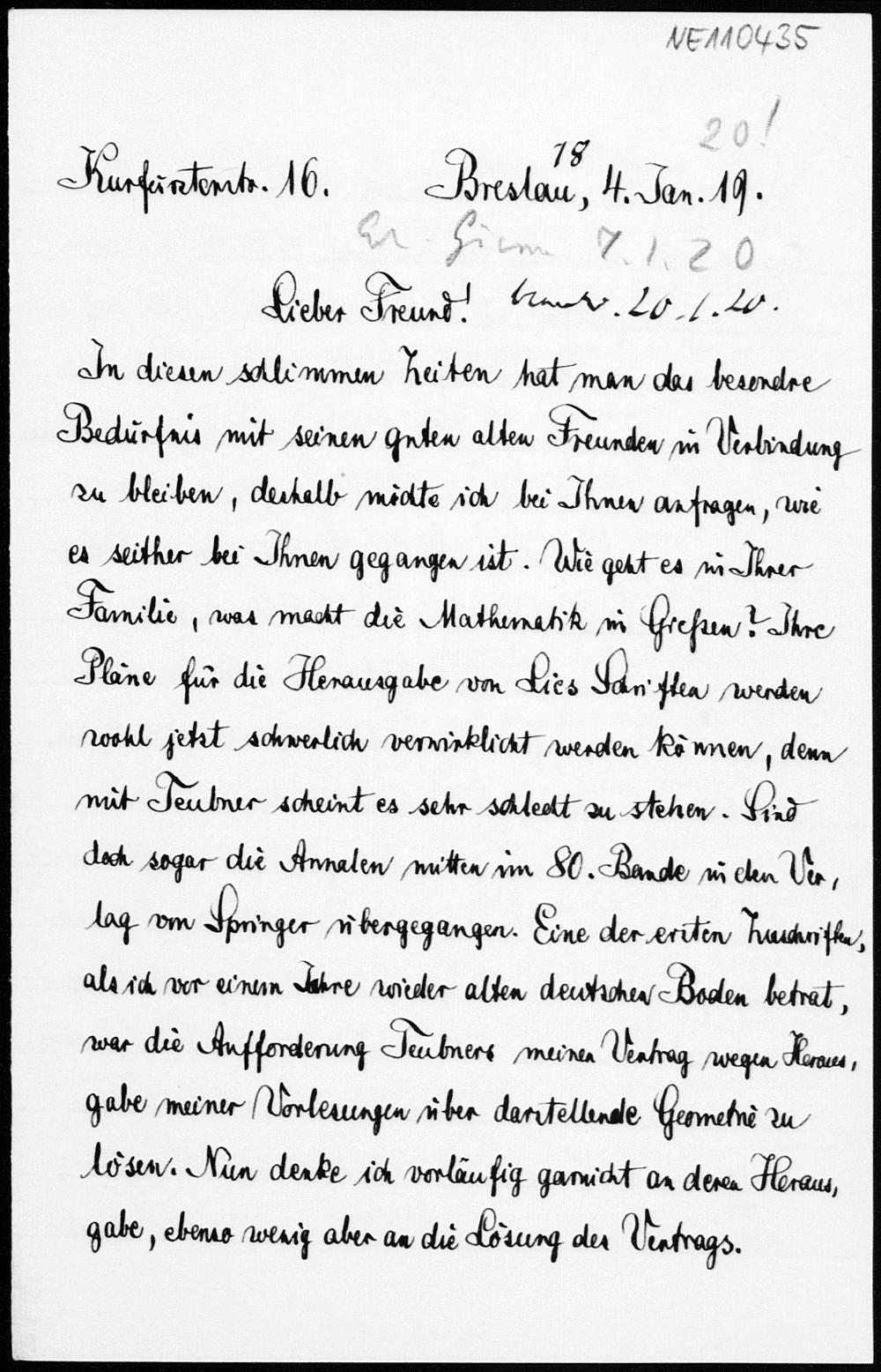 Brief von Friedrich Schur an Friedrich Engel vom 4.1.1920