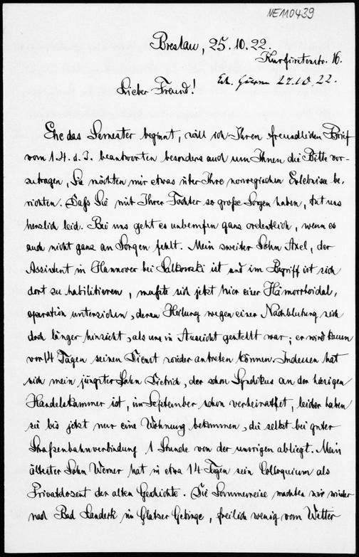 Brief von Friedrich Schur an Friedrich Engel vom 25.10.1922