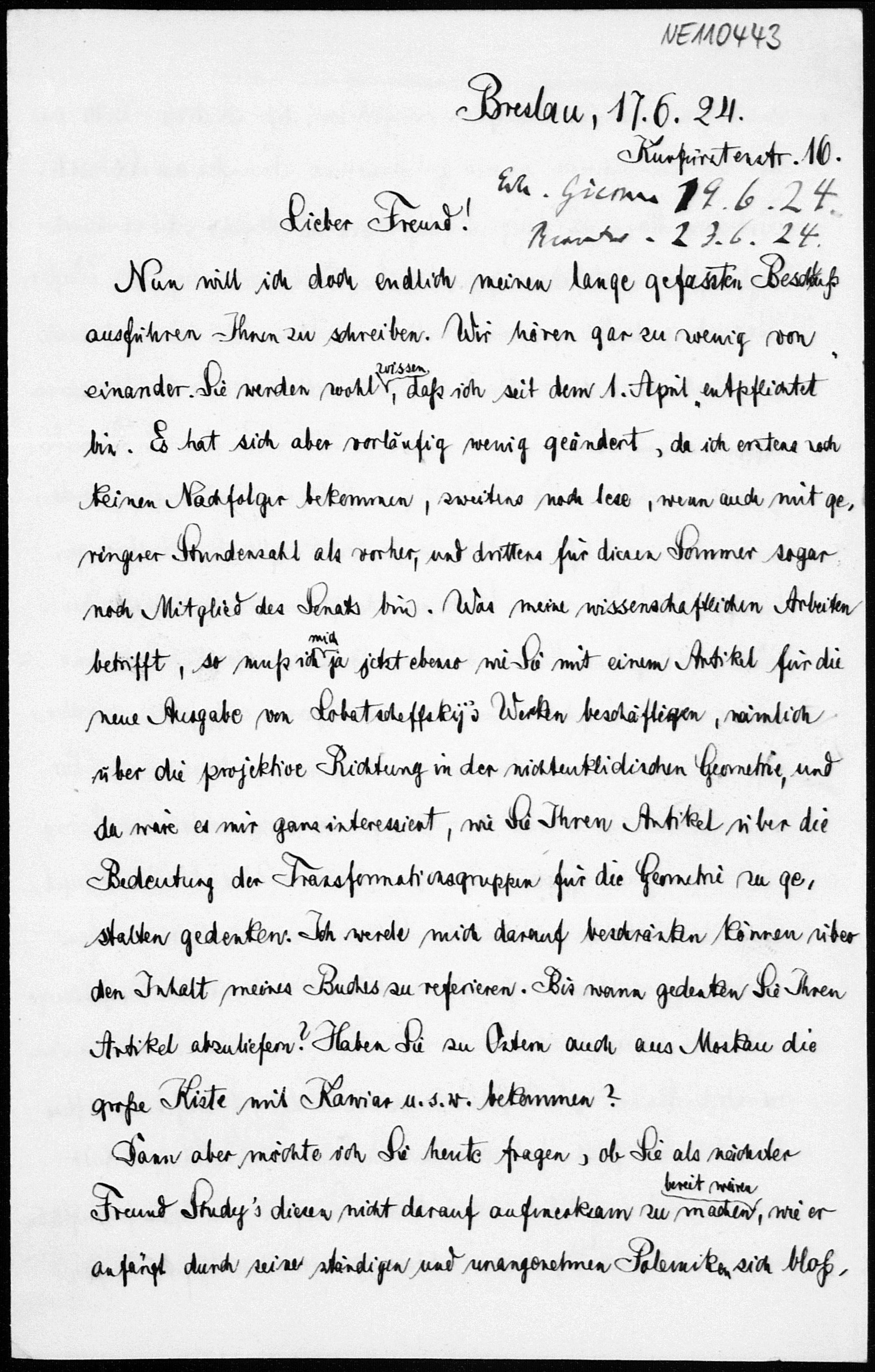 Brief von Friedrich Schur an Friedrich Engel vom 17.6.1924
