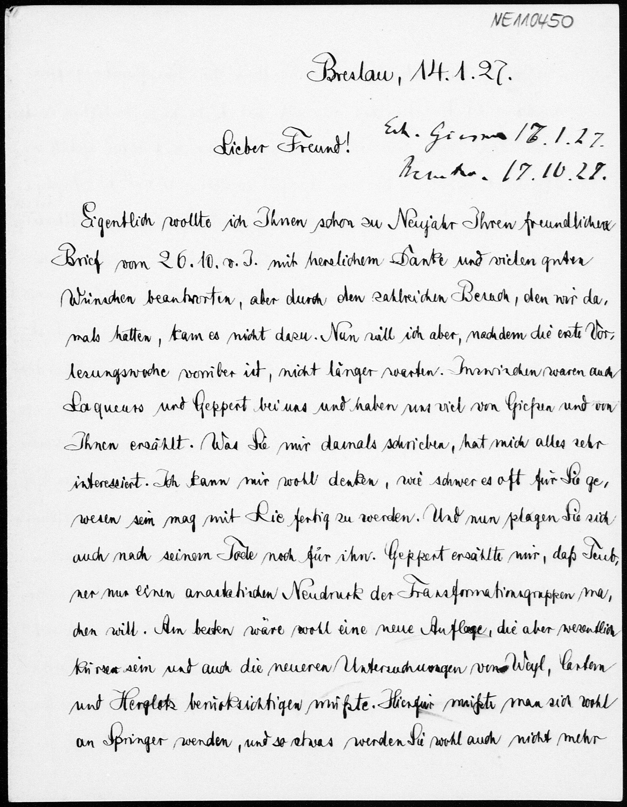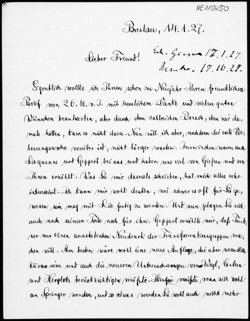 Brief von Friedrich Schur an Friedrich Engel vom 14.1.1927