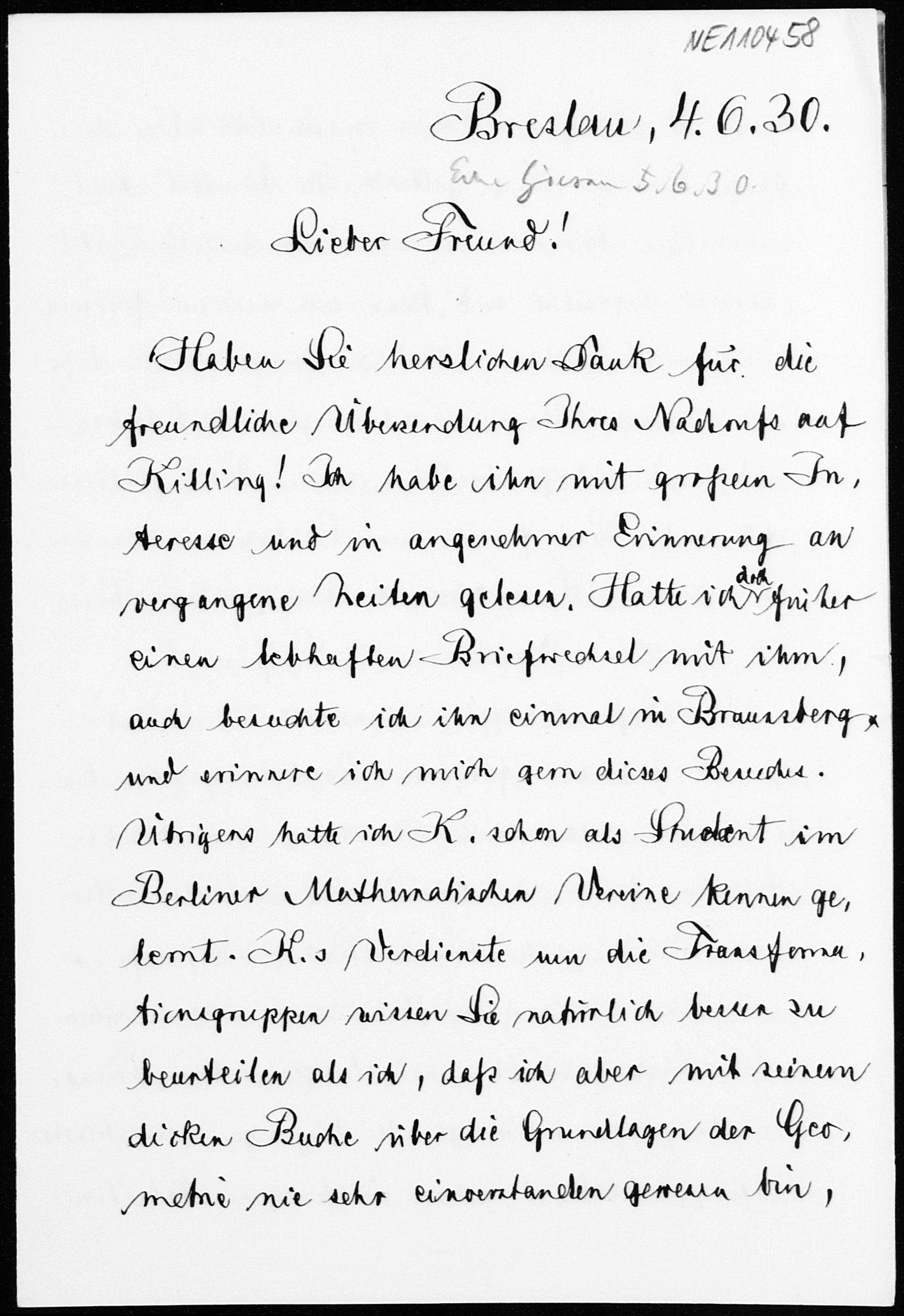 Brief von Friedrich Schur an Friedrich Engel vom 4.6.1930