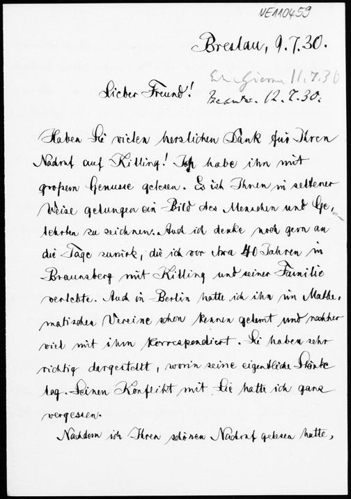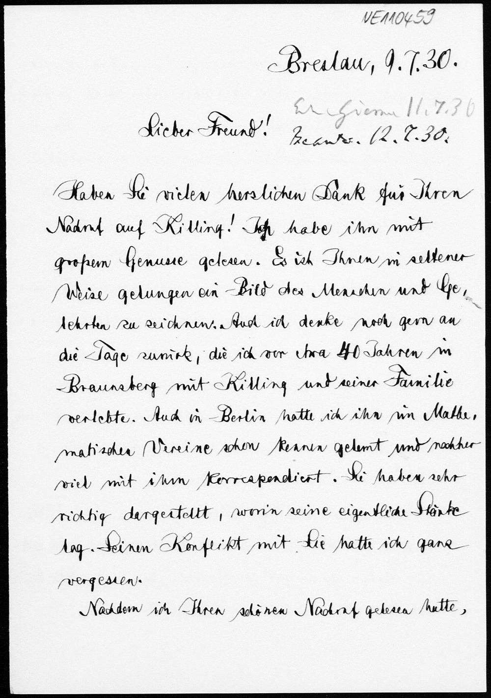 Brief von Friedrich Schur an Friedrich Engel vom 9.7.1930