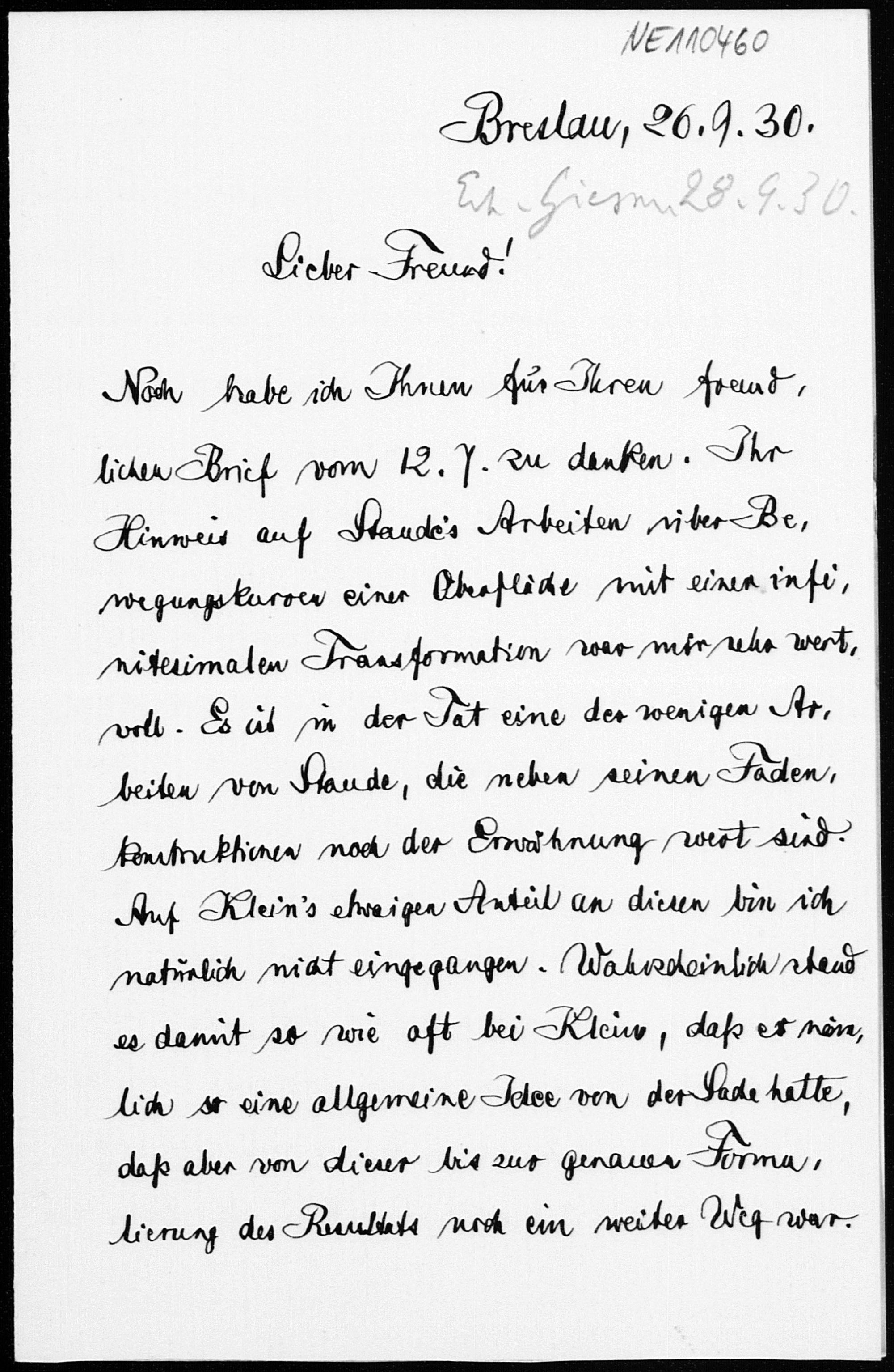 Brief von Friedrich Schur an Friedrich Engel vom 26.9.1930