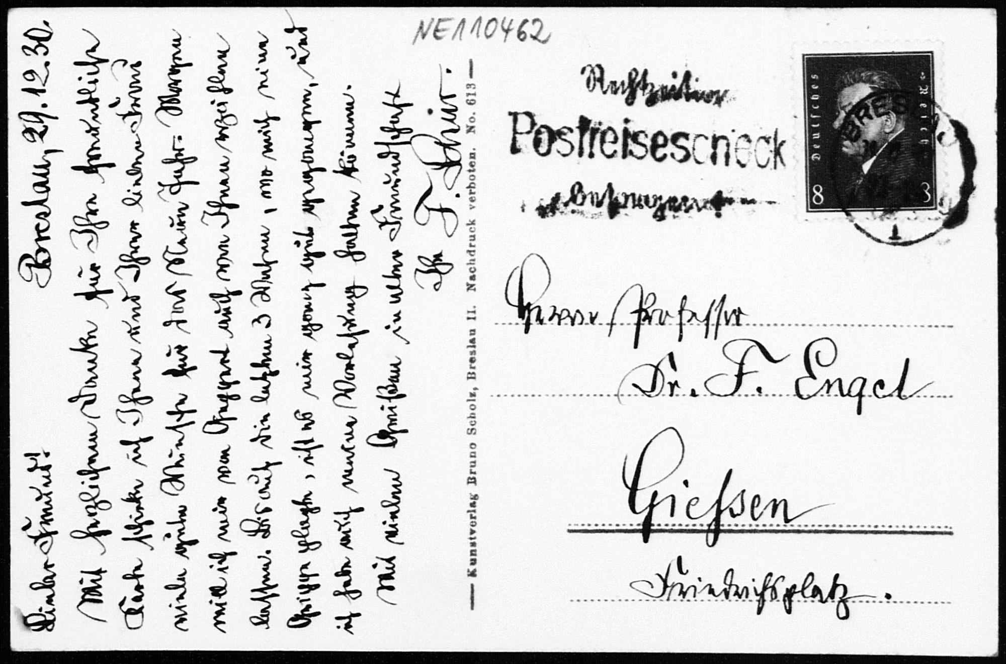 Ansichtskarte von Friedrich Schur an Friedrich Engel vom 29.12.1930