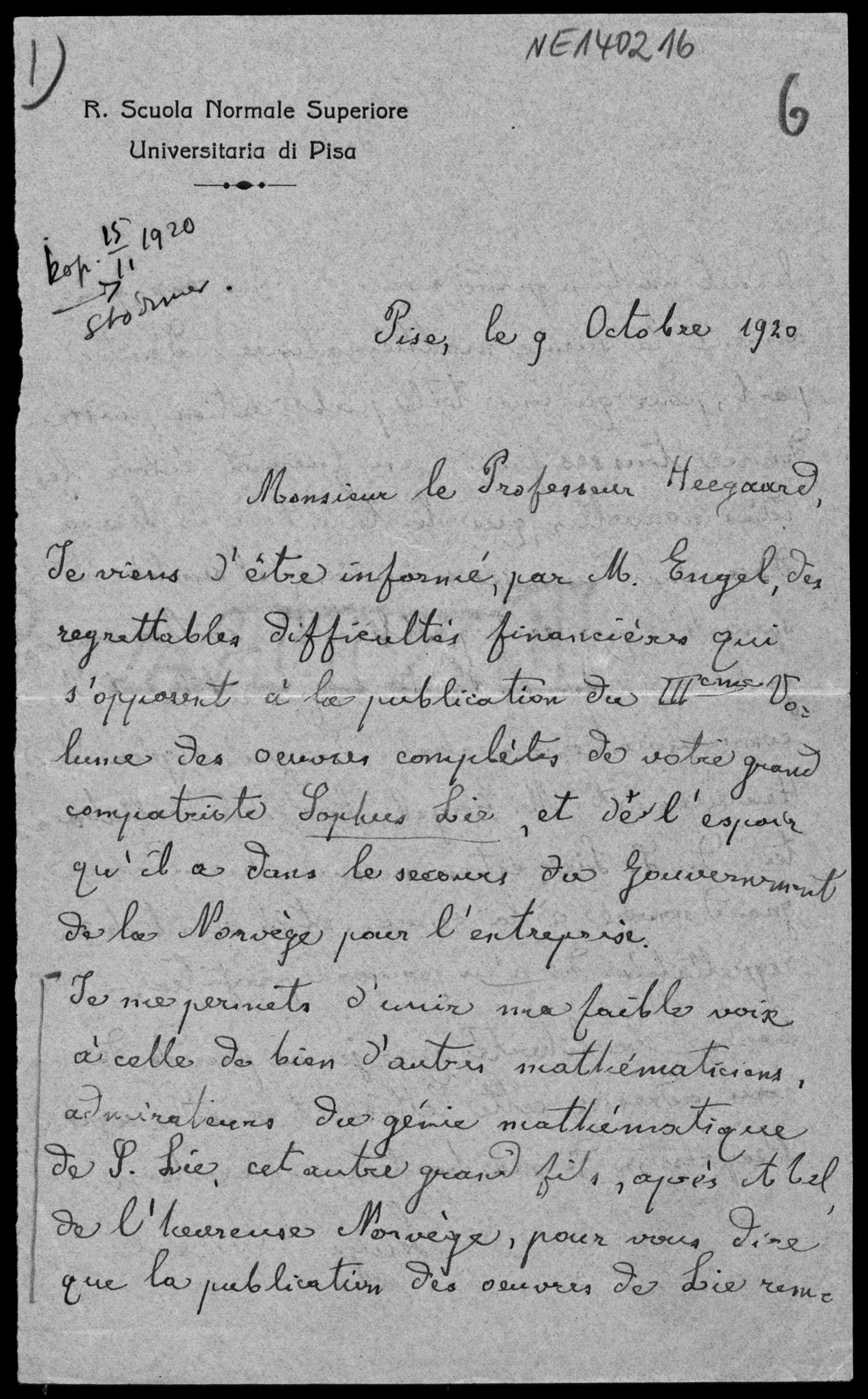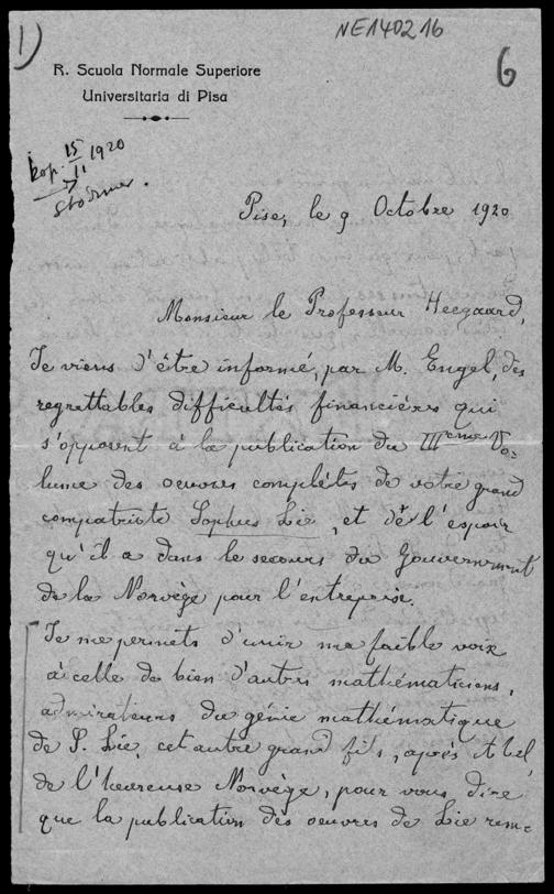 Brief von Luigi Bianchi an Poul Heegaard vom 9.10.1920