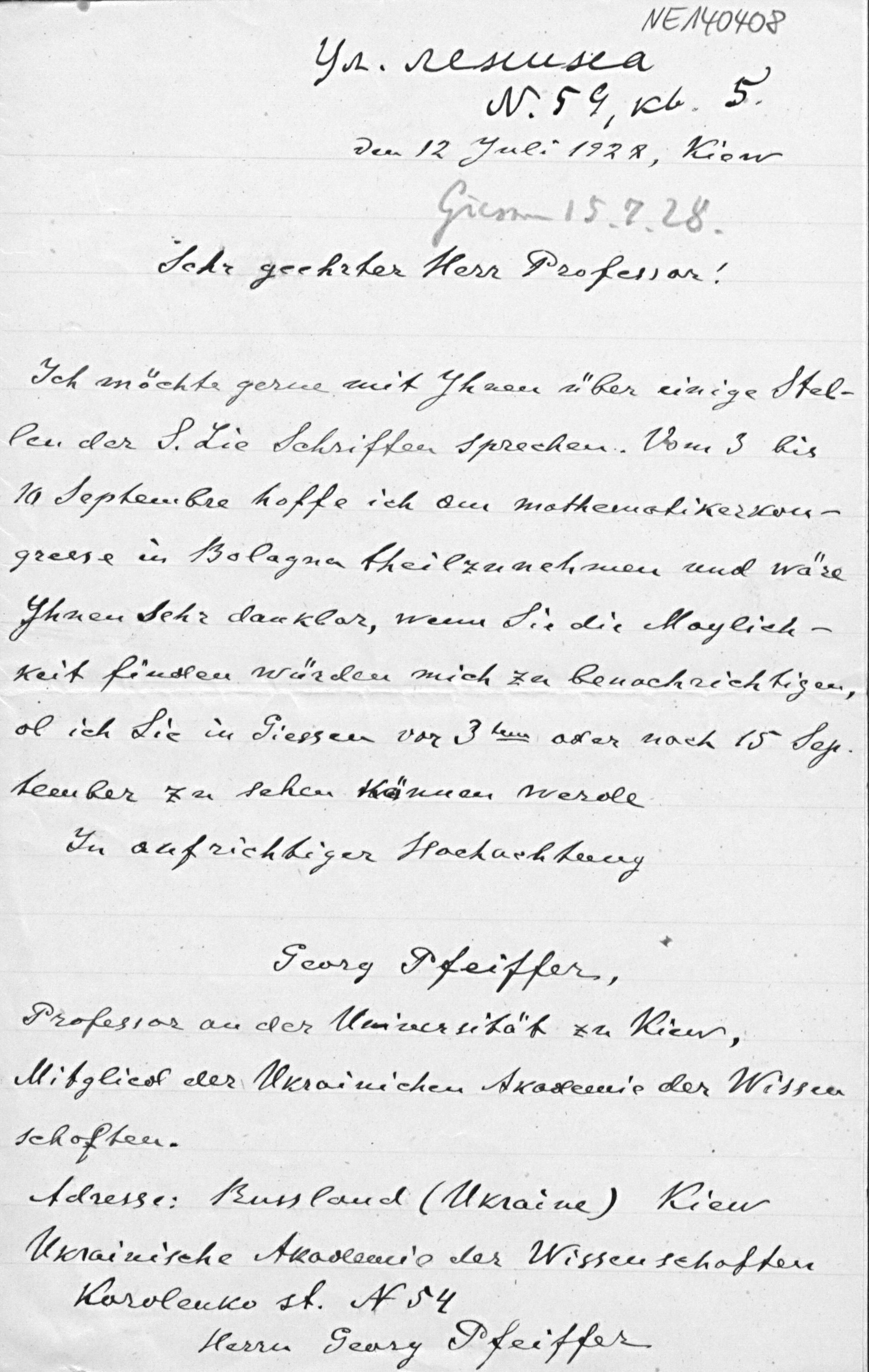 Brief von Georg Pfeiffer an Friedrich Engel vom 12.7.1928