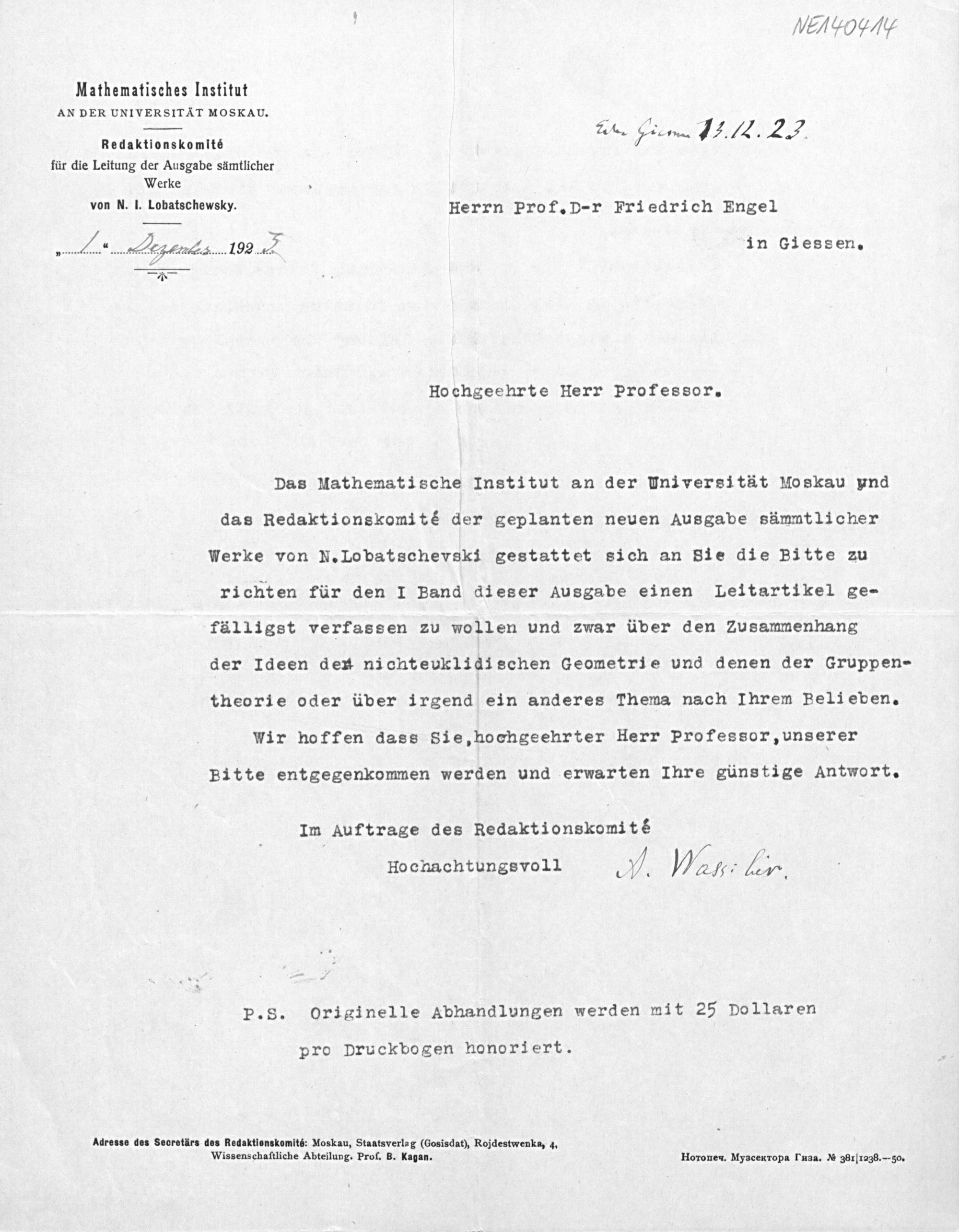 Brief vom Redaktionskomité für die Leitung der Ausgabe sämtlicher Werke von N. I. Lobatschewsky an Friedrich Engel vom 1.12.1923