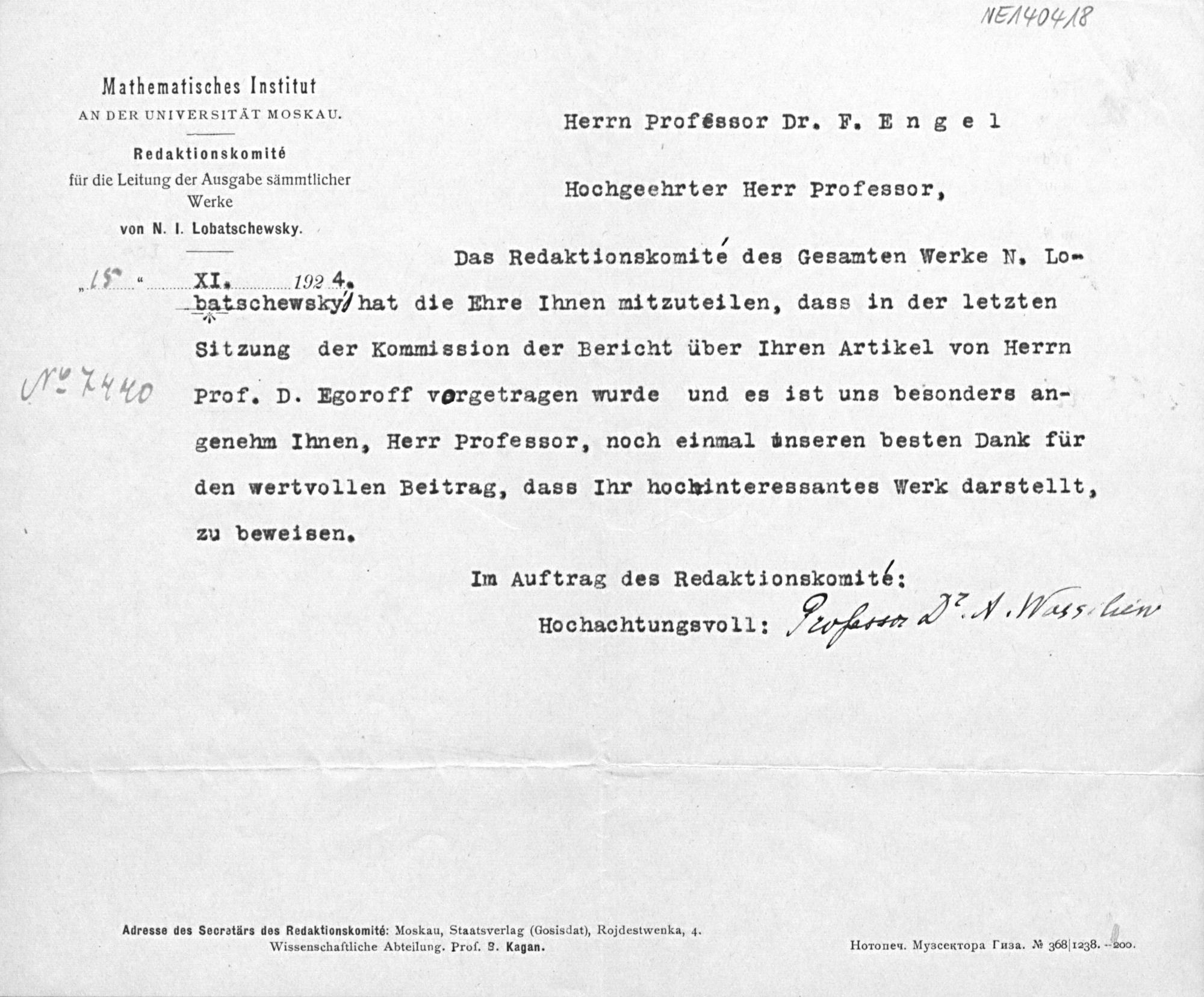 Brief vom Redaktionskomité für die Leitung der Ausgabe sämtlicher Werke von N. I. Lobatschewsky an Friedrich Engel vom 15.11.1924