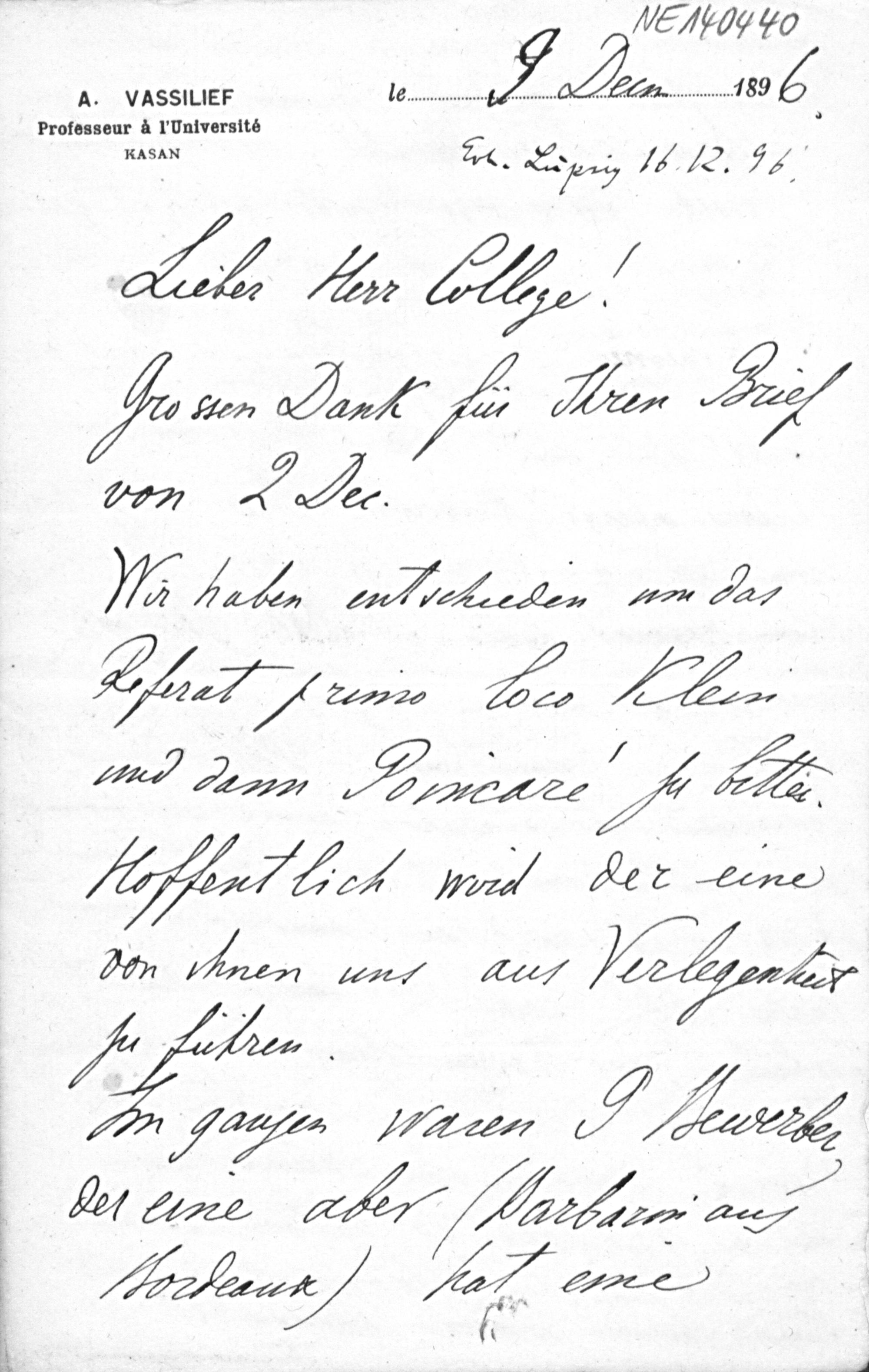 Brief von Alexander Wassiliew an Friedrich Engel vom 9.12.1896