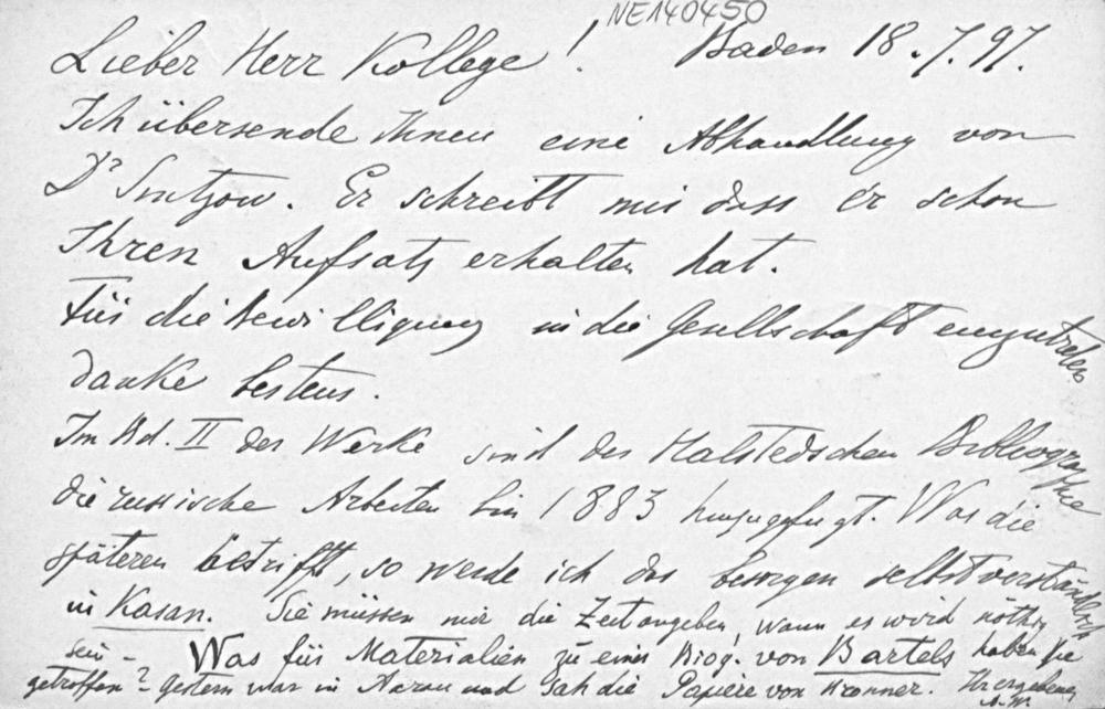 Postkarte von Alexander Wassiliew an Friedrich Engel vom 18.7.1897