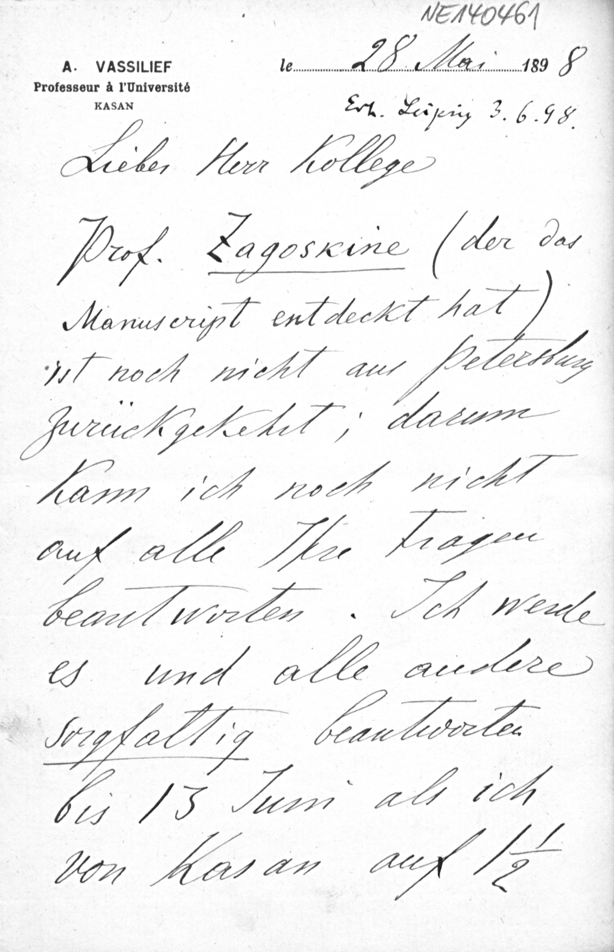 Brief von Alexander Wassiliew an Friedrich Engel vom 28.5.1898