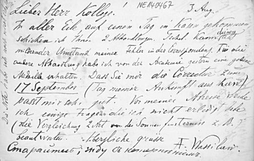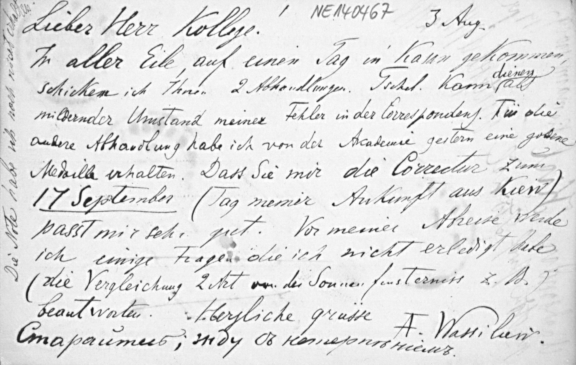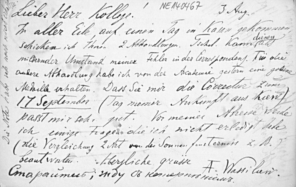 Postkarte von Alexander Wassiliew an Friedrich Engel vom 3.8.1898