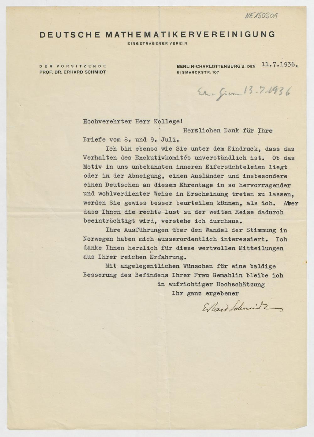 Brief von Erhard Schmidt an Friedrich Engel vom 11.7.1936