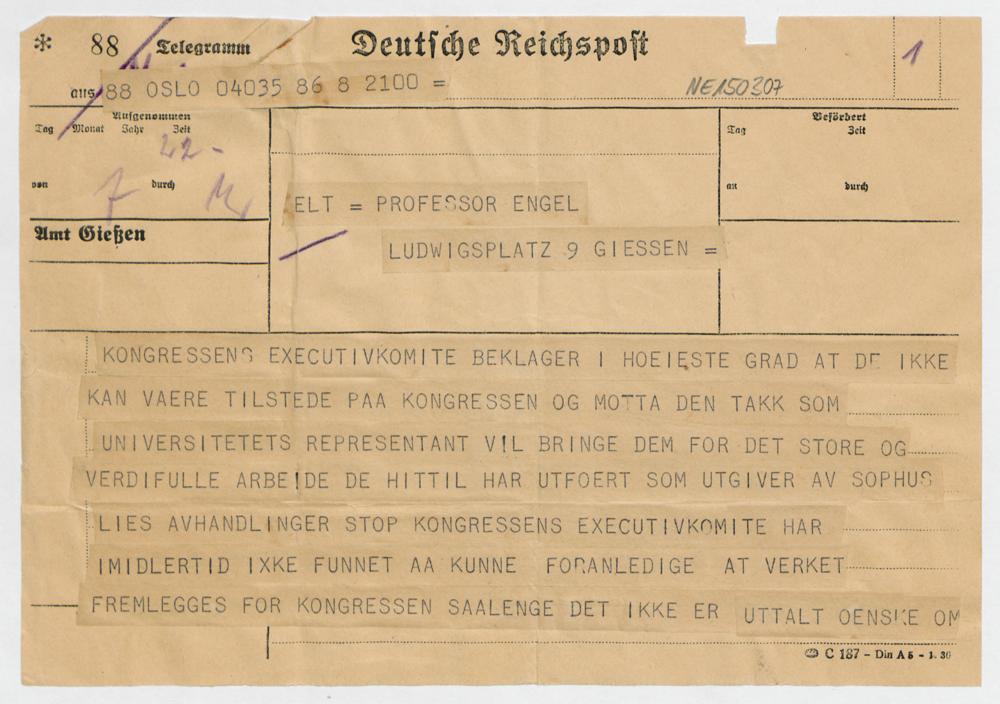 Telegramm vom Exekutivkomitee des Internationalen Mathematiker-Kongresses in Oslo an Friedrich Engel o.D