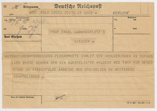 Telegramm vom Plenum des Internationalen Mathematiker-Kongresses in Oslo an Friedrich Engel vom 13.7.1936