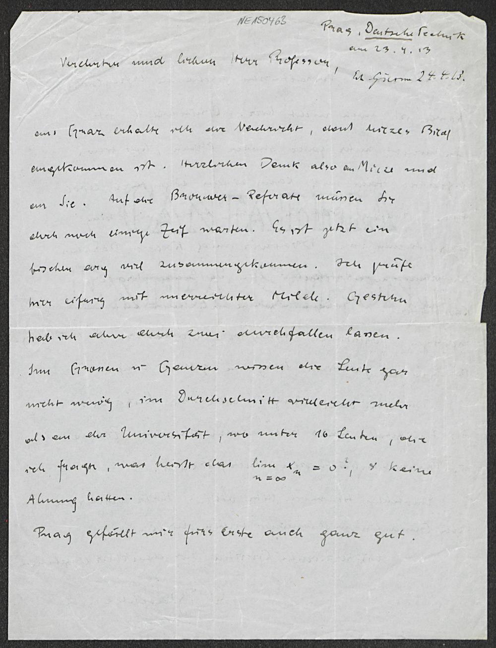 Brief von Wilhelm Blaschke an Friedrich Engel vom 23.4.1913