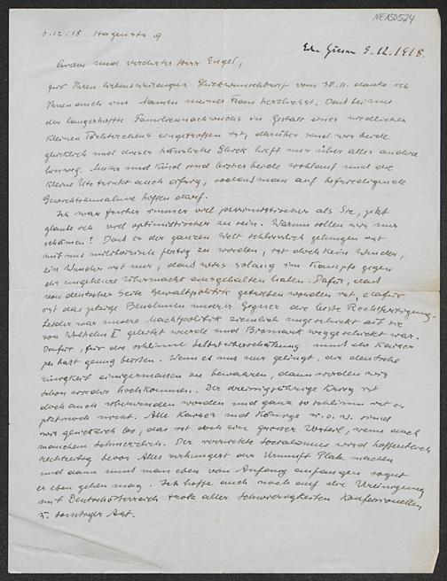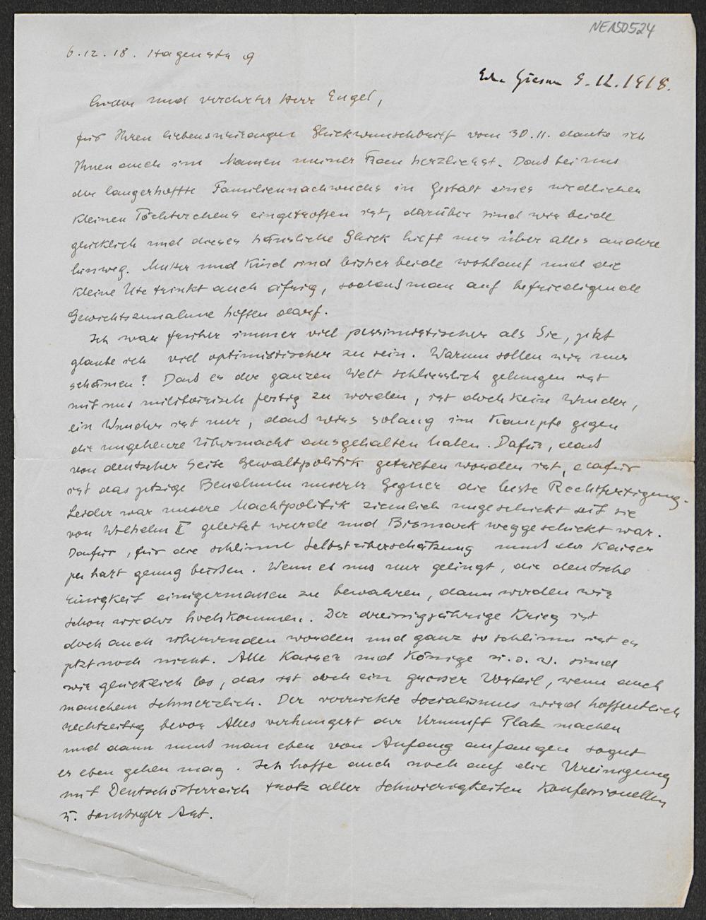 Brief von Wilhelm Blaschke an Friedrich Engel vom 6.12.1918