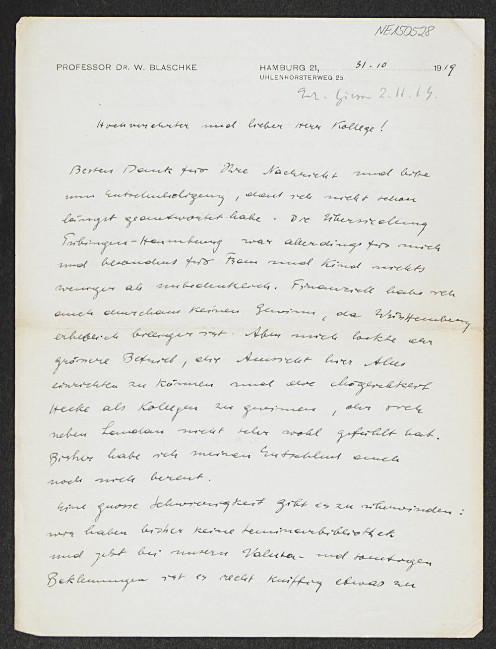 Brief von Wilhelm Blaschke an Friedrich Engel vom 31.10.1919