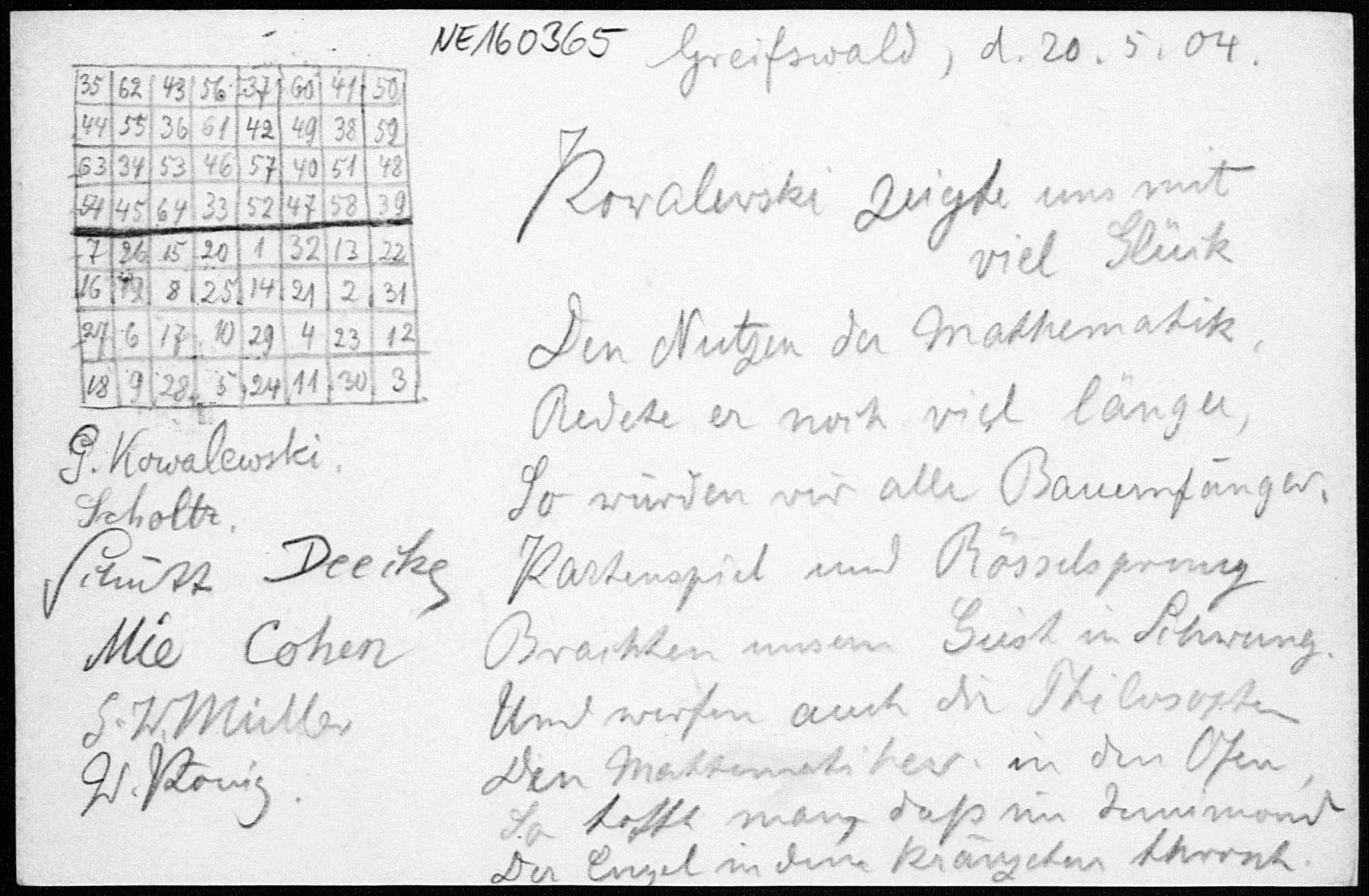 Postkarte von Gerhard Kowalewski an Friedrich Engel vom 20.5.1904 (mitunterzeichnet von Scholtz, Schutt, Deeike, Mie, Cohen, G. W. Müller, W[alter] König)