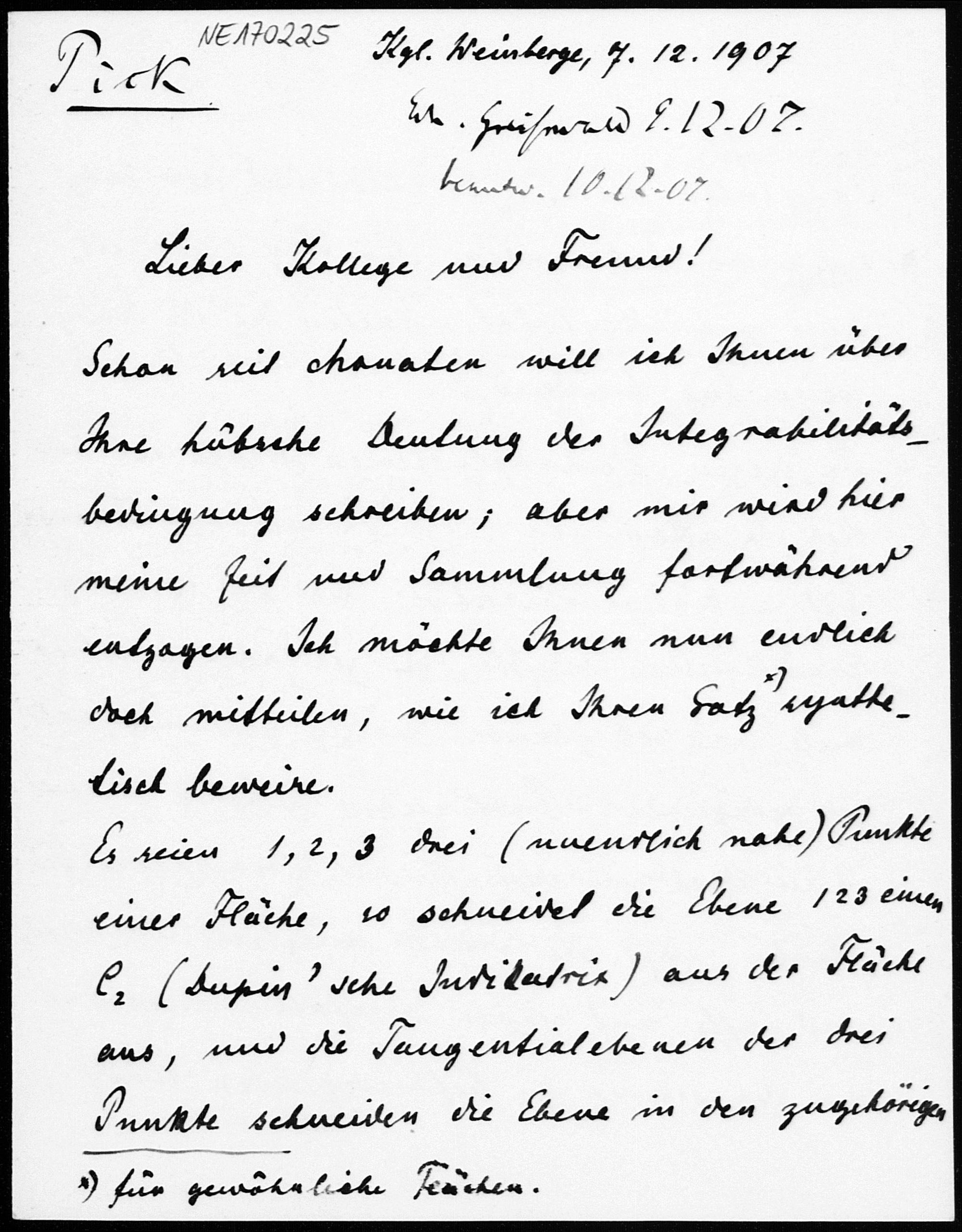 Brief von Georg Pick an Friedrich Engel vom 7.12.1907