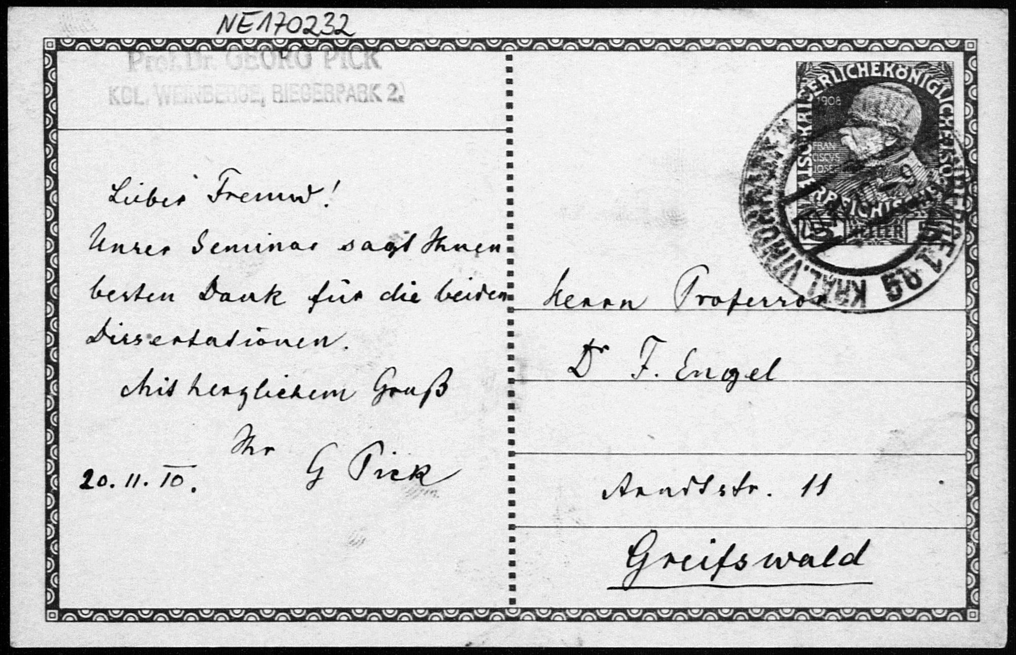Postkarte von Georg Pick an Friedrich Engel vom 20.11.1910