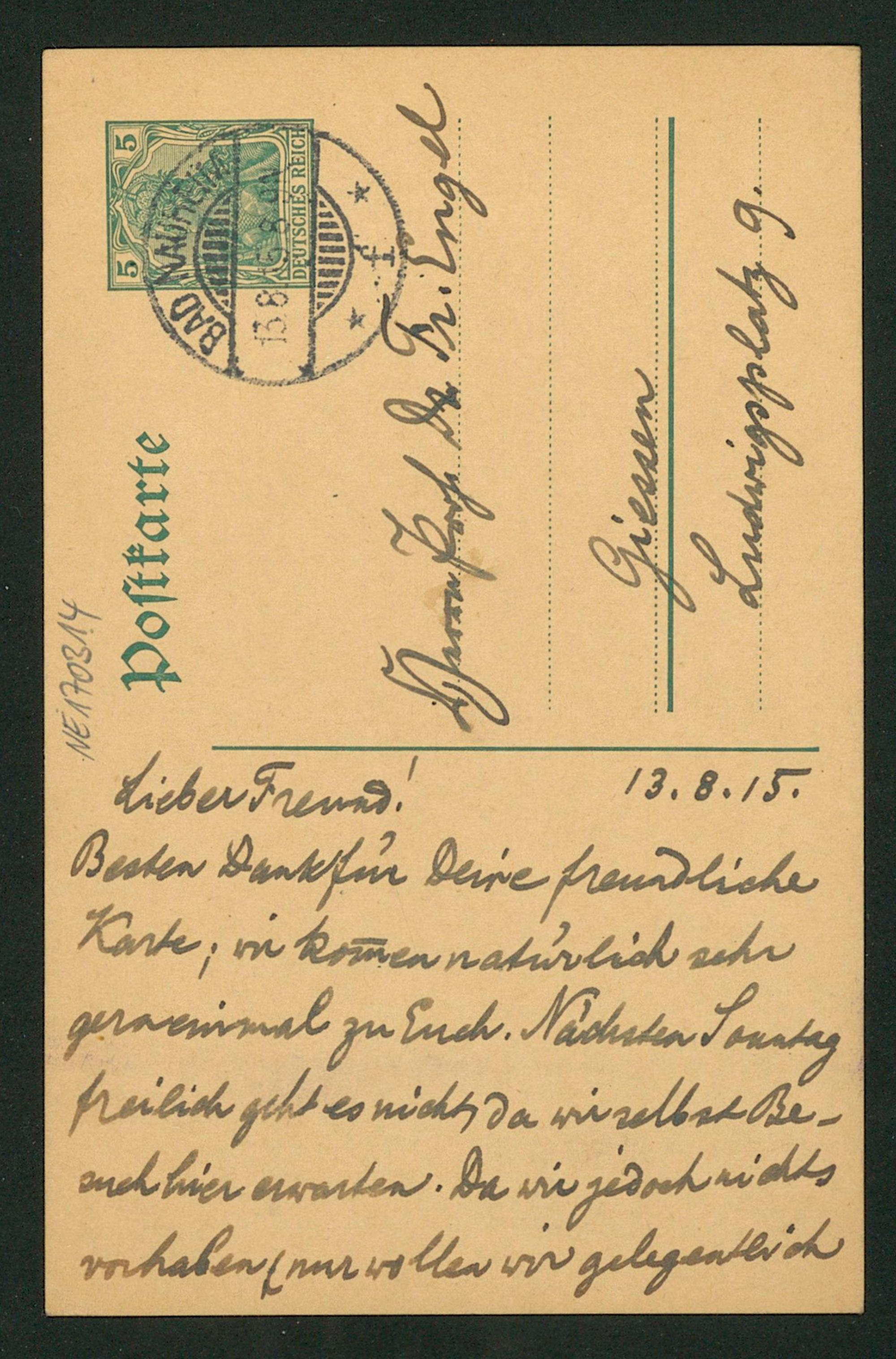 Postkarte von Karl Rohn an Friedrich Engel vom 13.8.1915