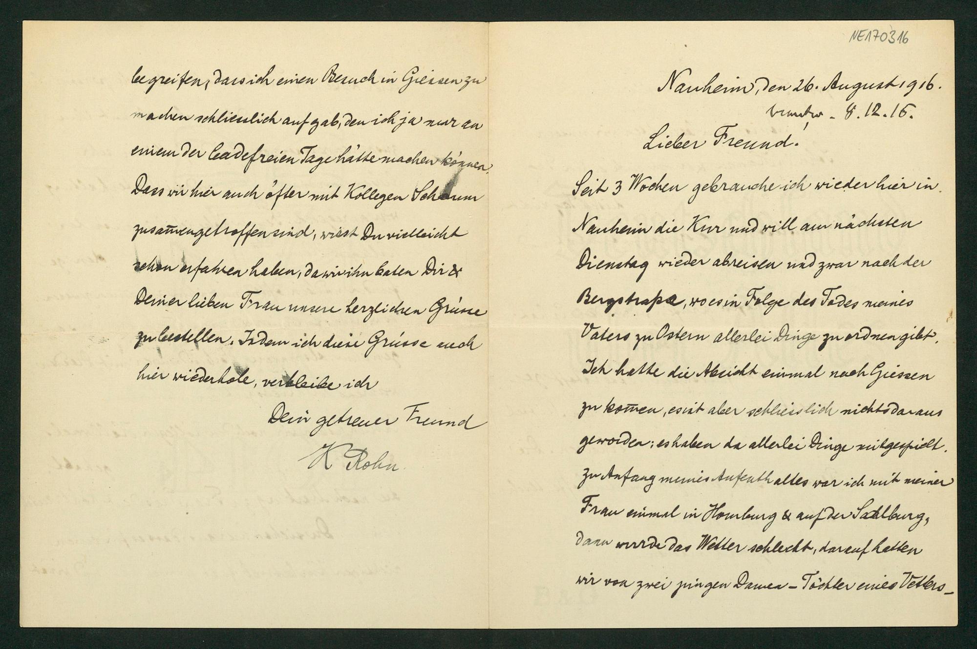Brief von Karl Rohn an Friedrich Engel vom 26.8.1916