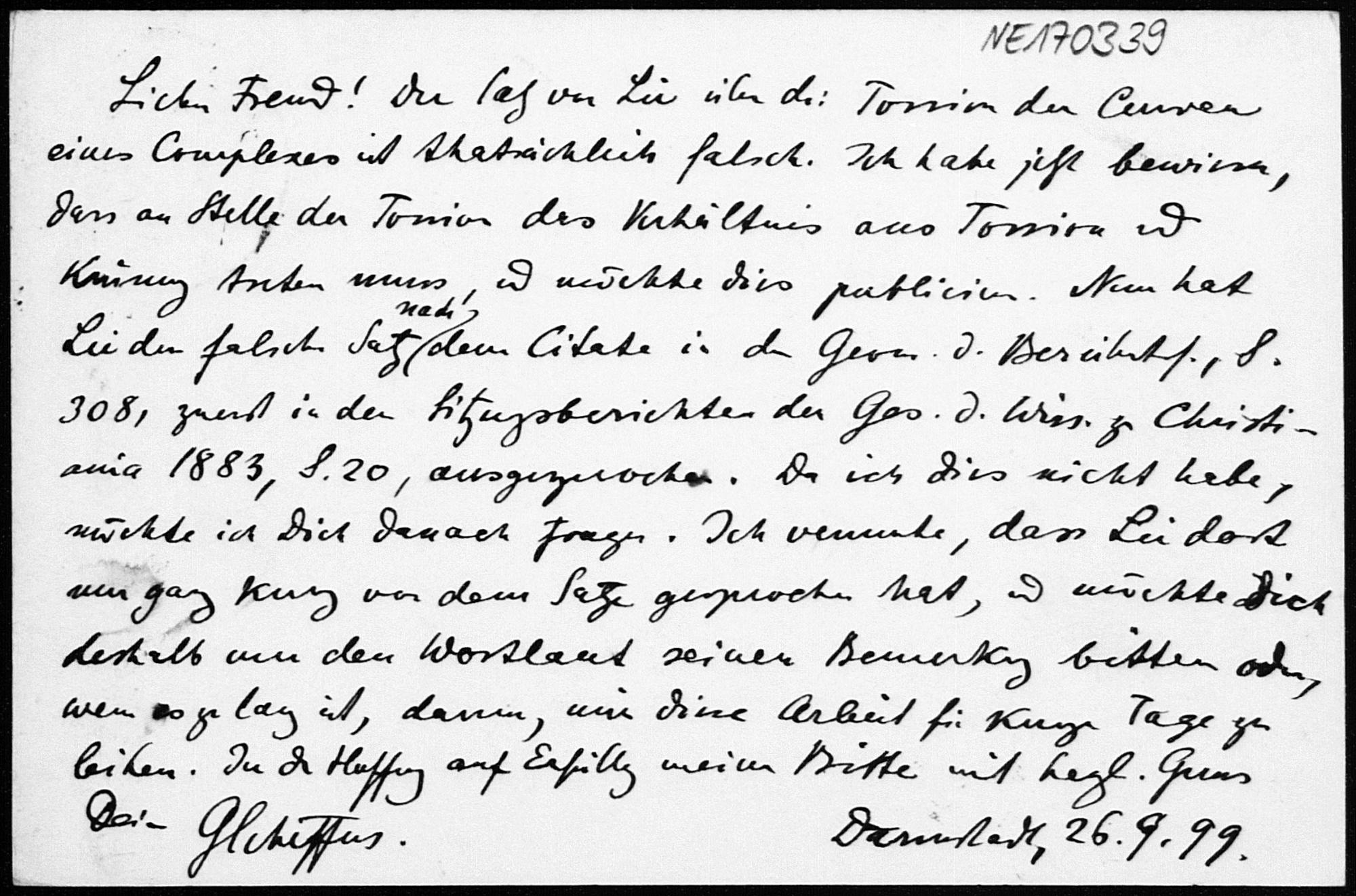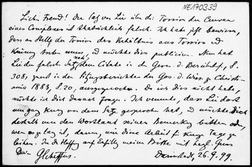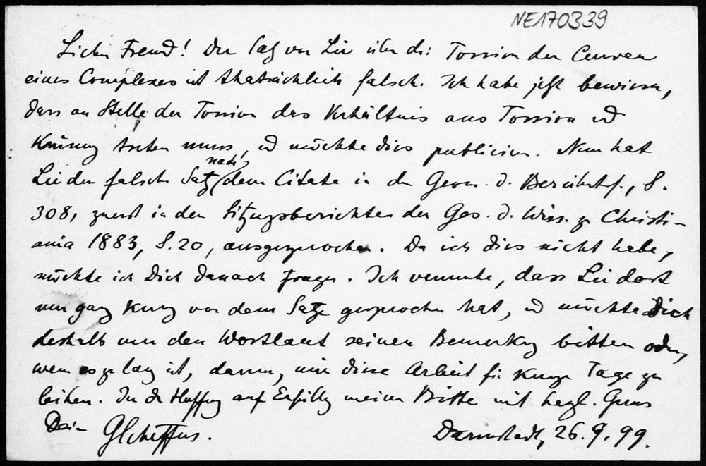 Postkarte von Georg Scheffers an Friedrich Engel vom 26.9.1899