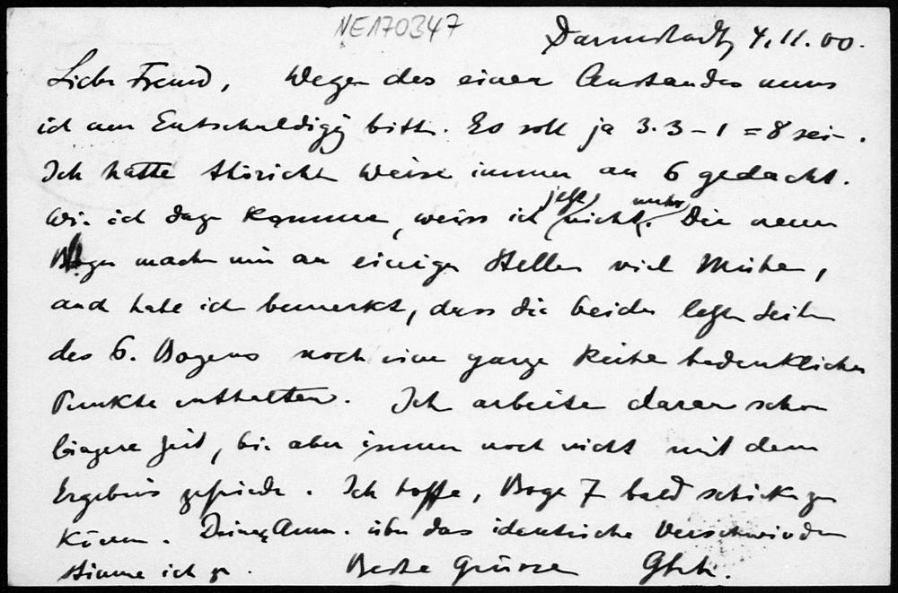 Postkarte von Georg Scheffers an Friedrich Engel vom 4.11.1900