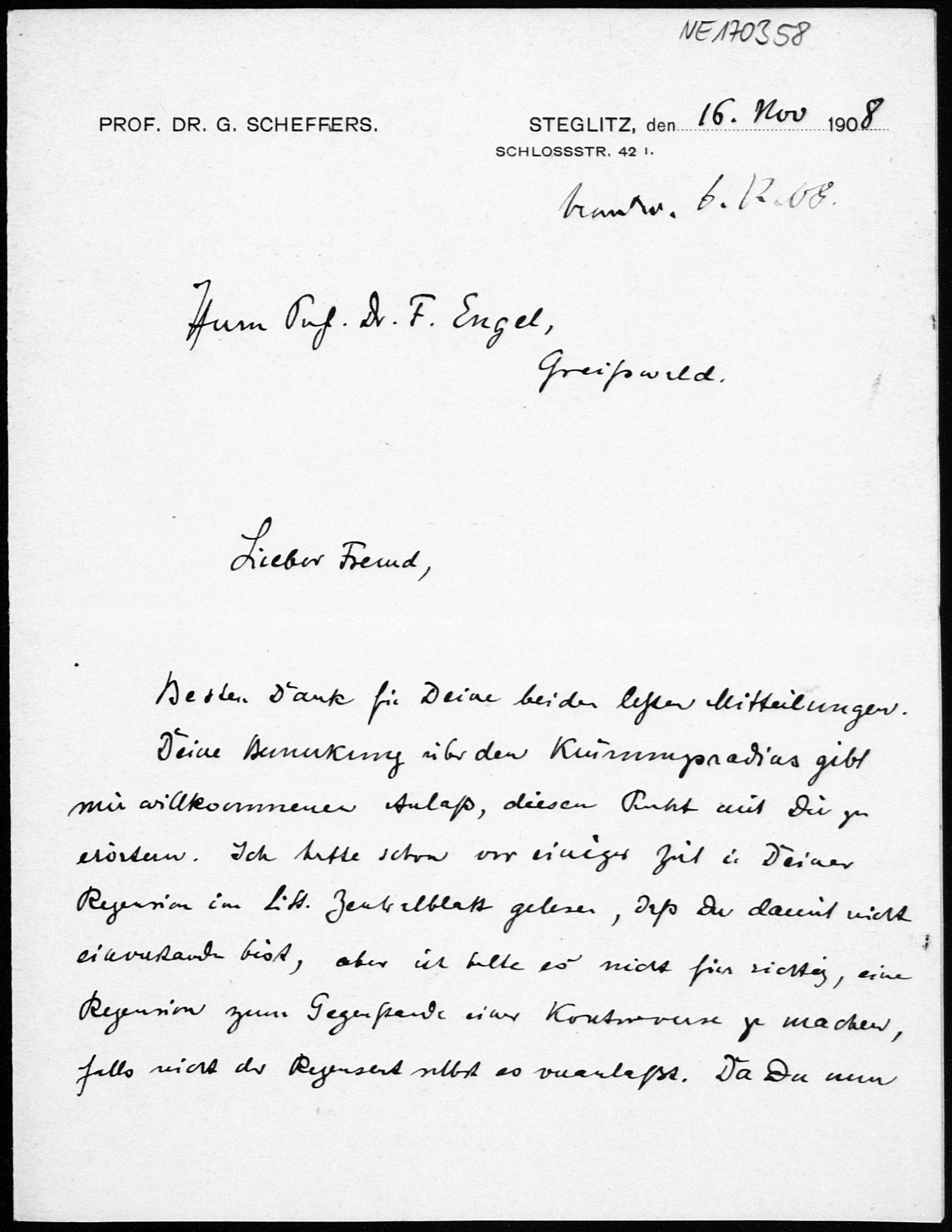 Brief von Georg Scheffers an Friedrich Engel vom 16.11.1908
