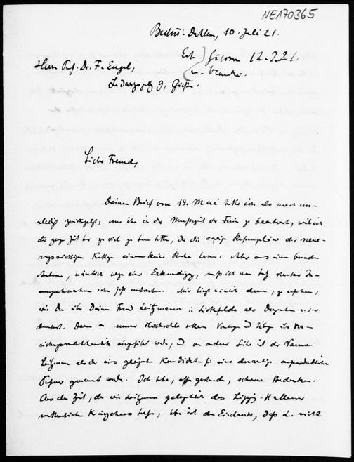 Brief von Georg Scheffers an Friedrich Engel vom 10.7.1921