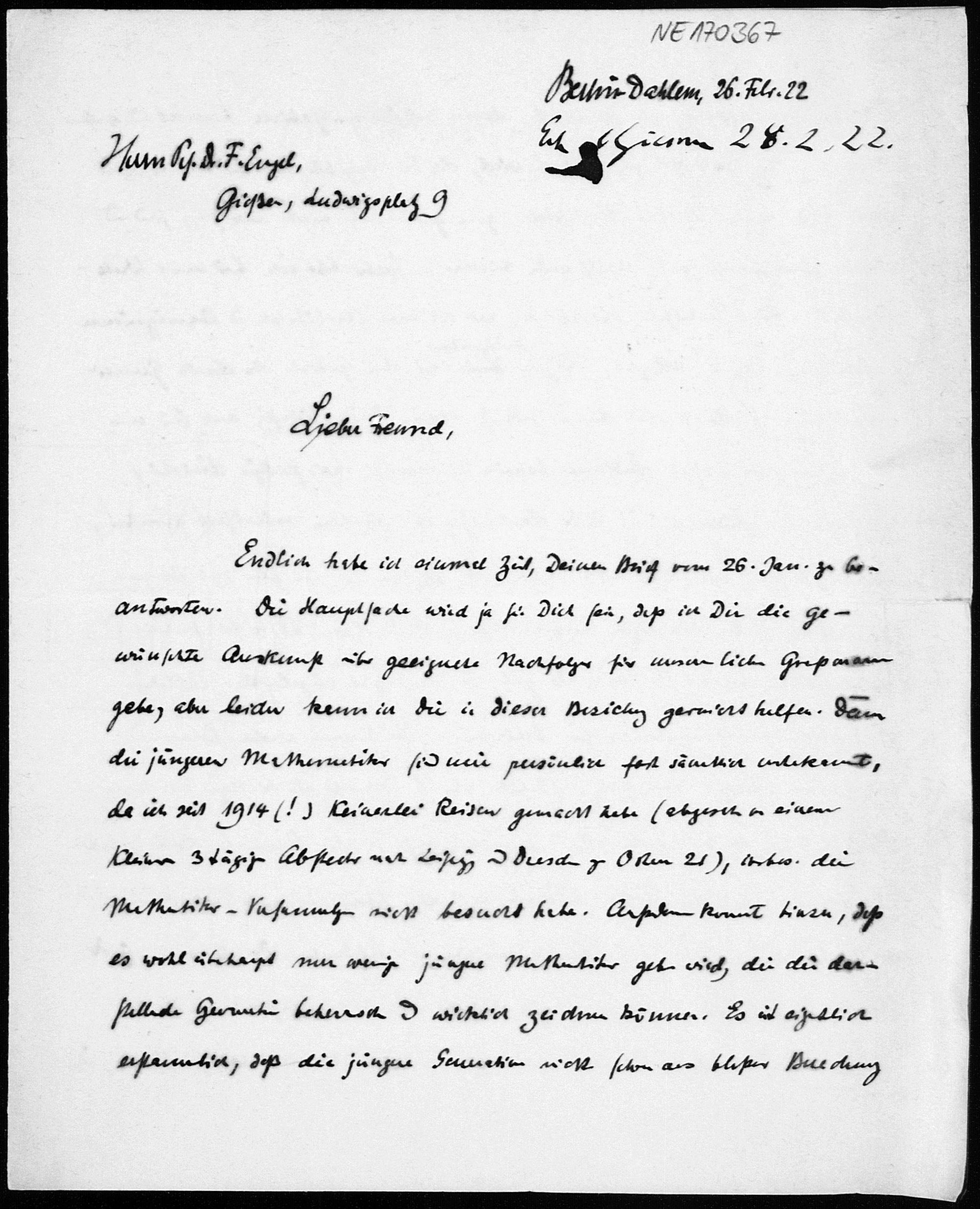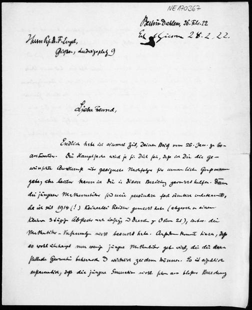 Brief von Georg Scheffers an Friedrich Engel vom 26.2.1922
