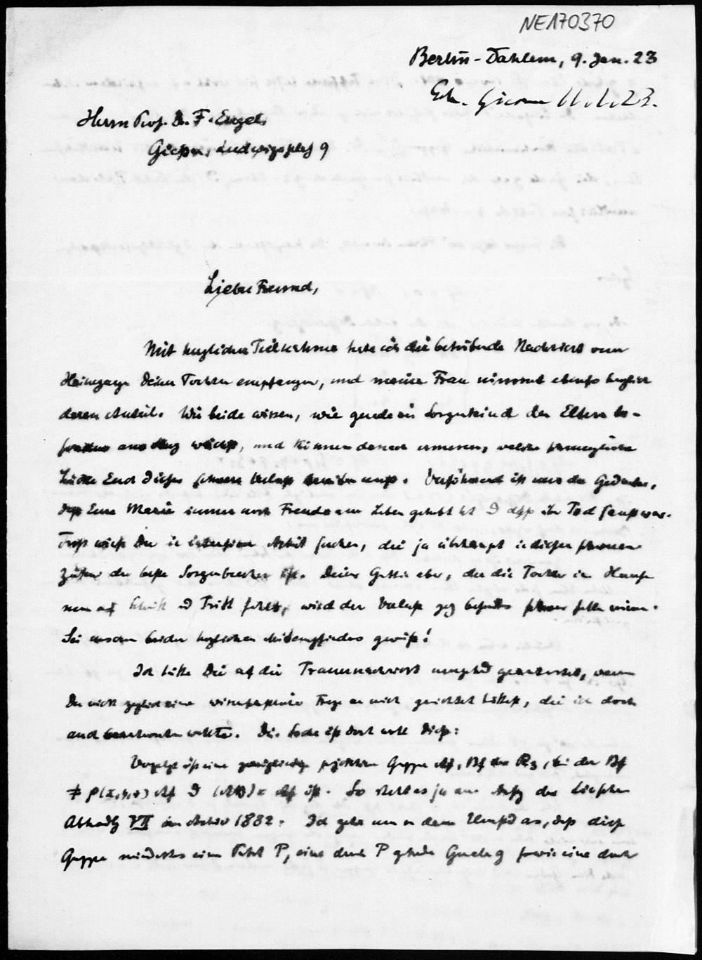 Brief von Georg Scheffers an Friedrich Engel vom 9.1.1923