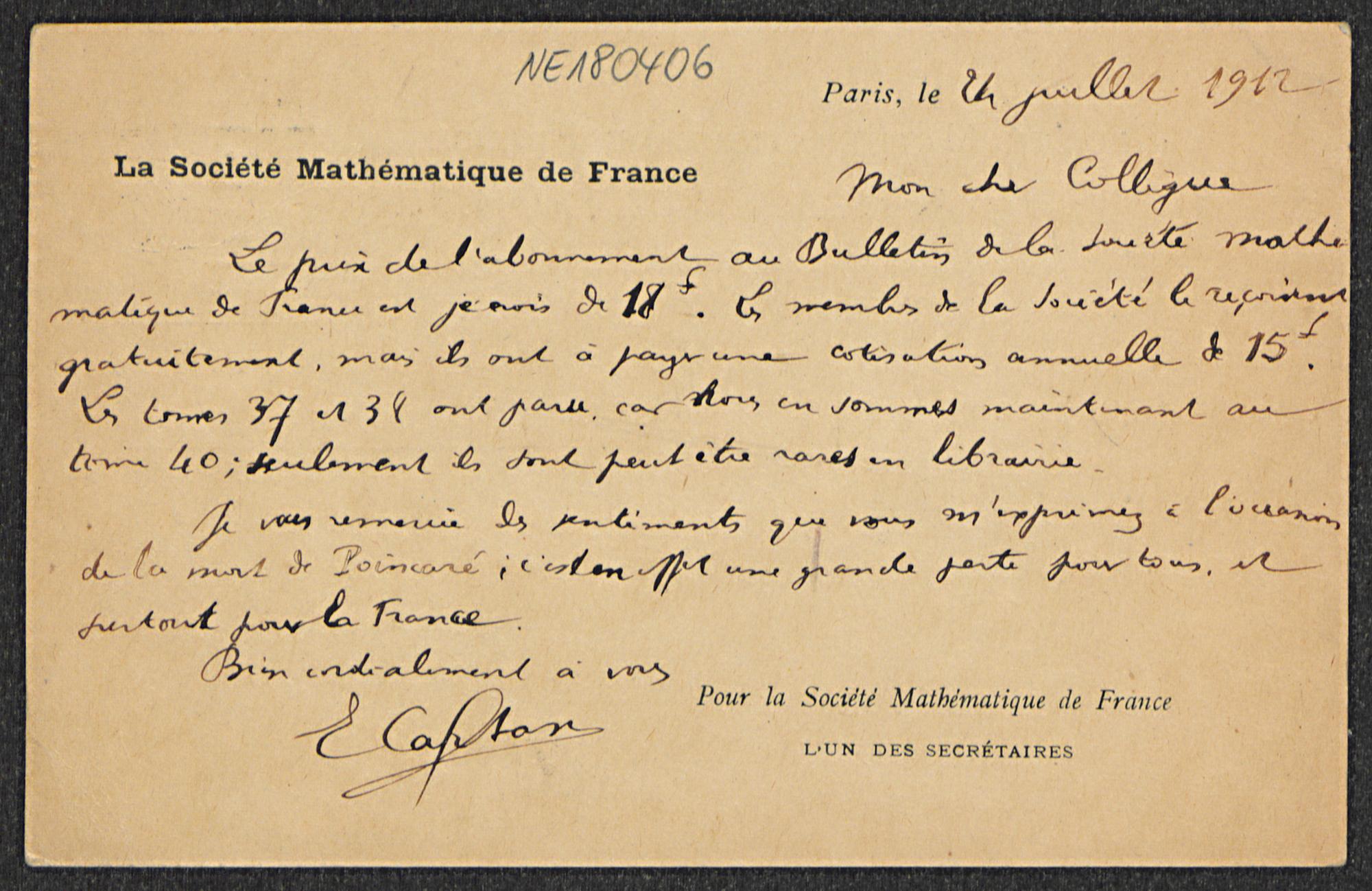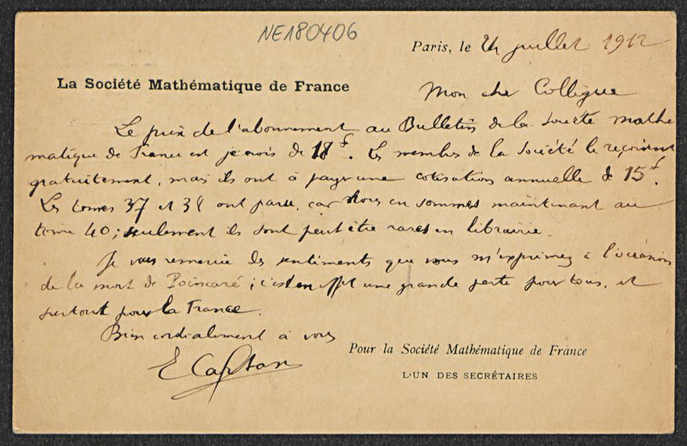 Postkarte von Élie Cartan an Friedrich Engel vom 24.7.1912