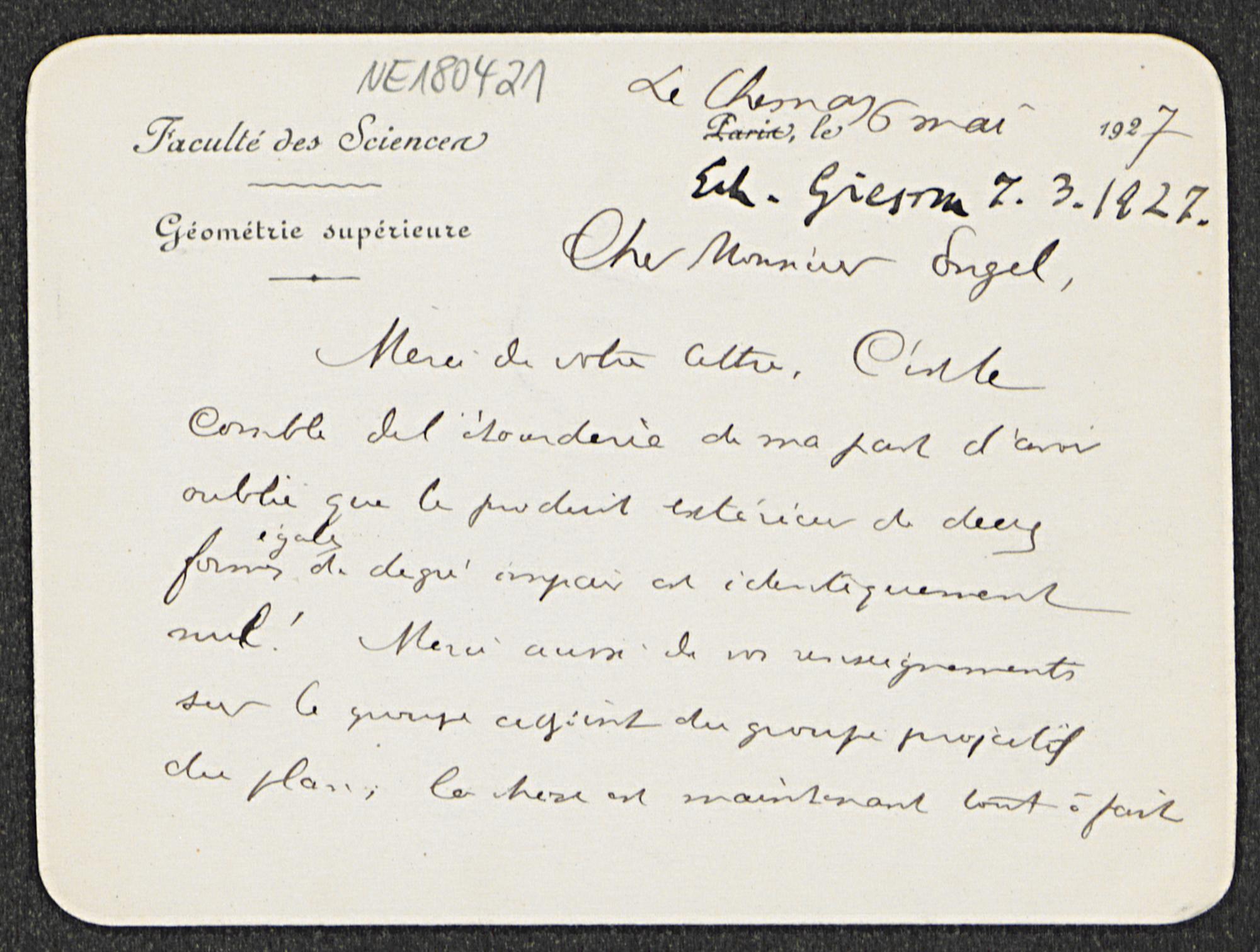 Briefkarte von Élie Cartan an Friedrich Engel vom 6.5.1927