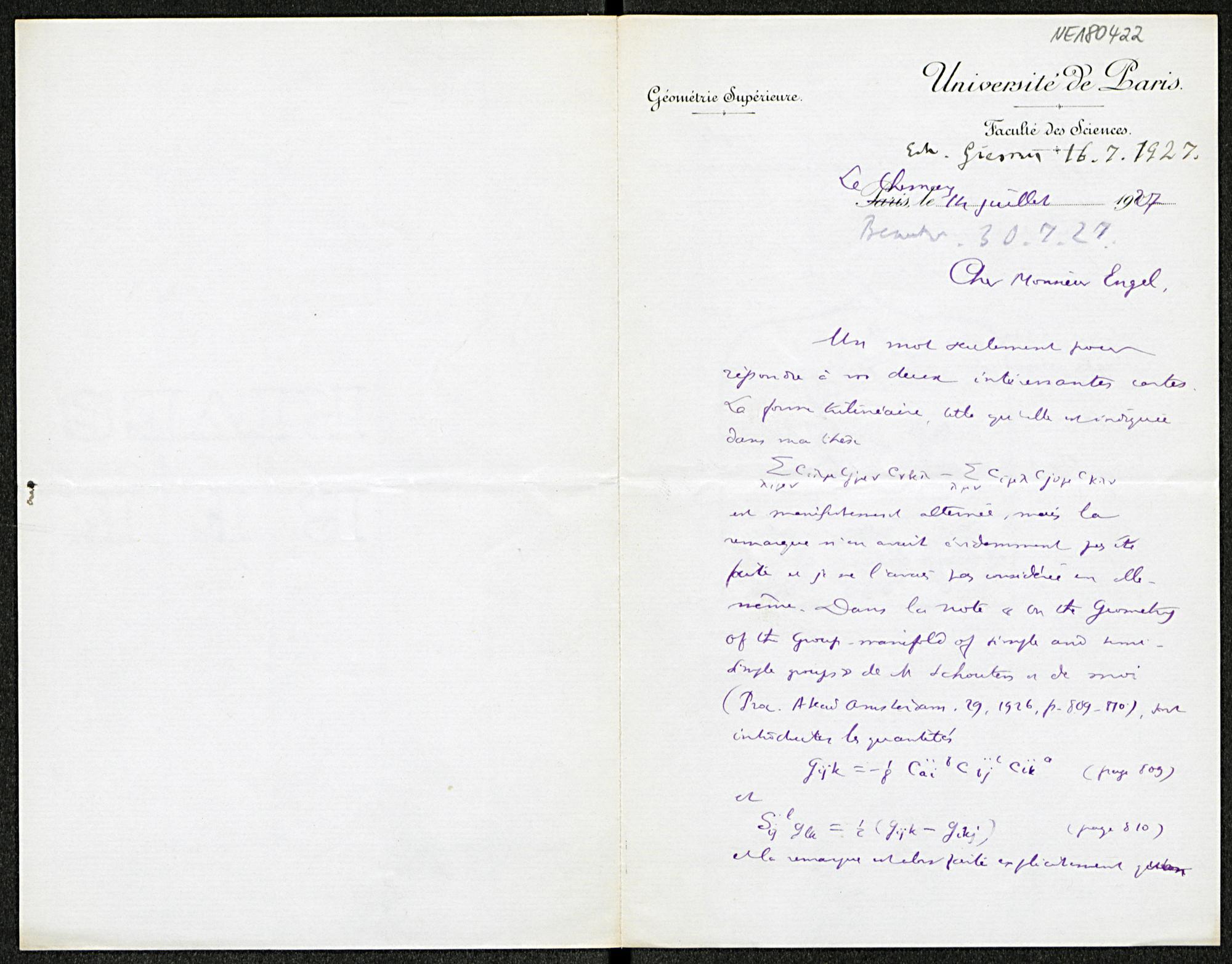 Brief von Élie Cartan an Friedrich Engel vom 14.7.1927