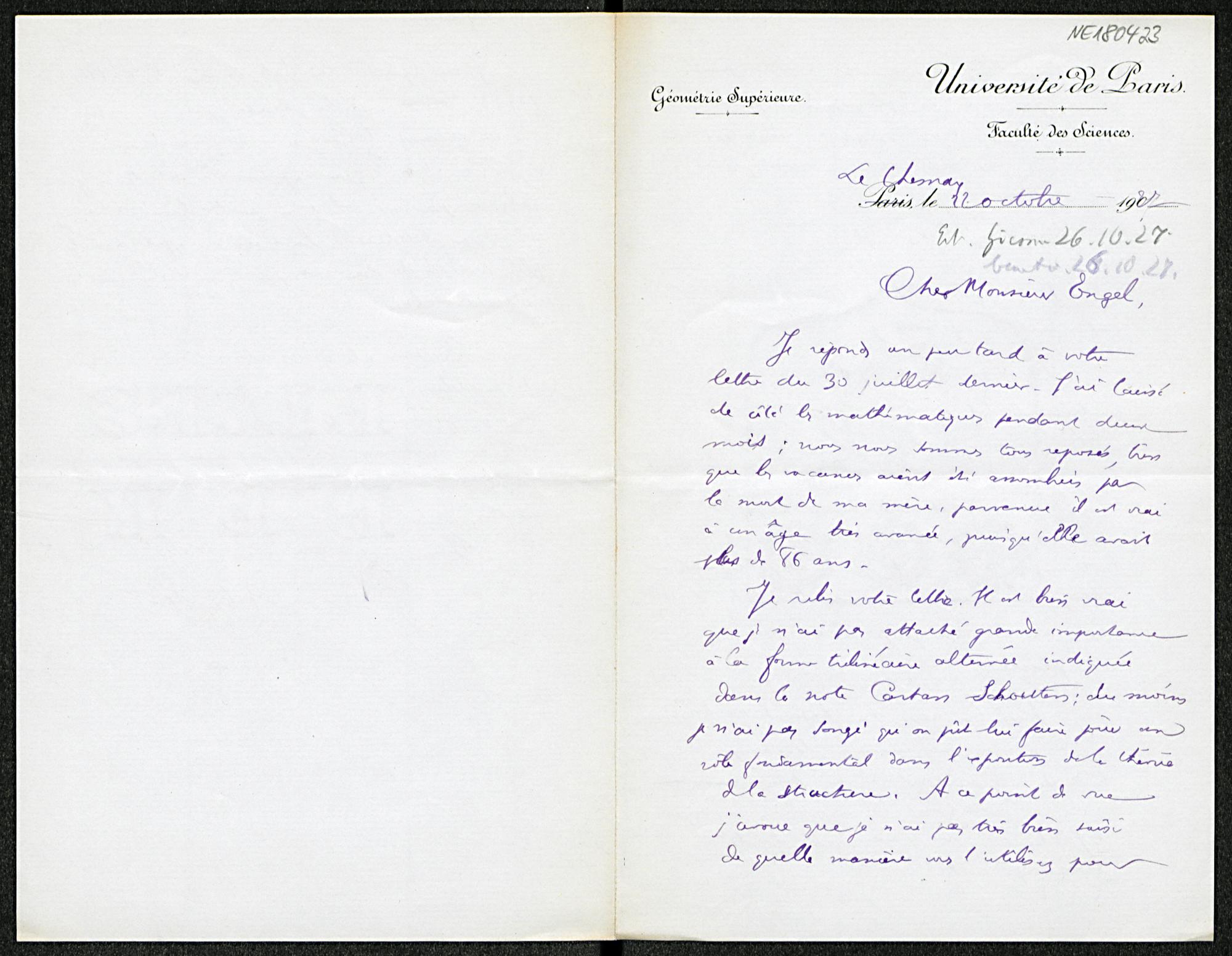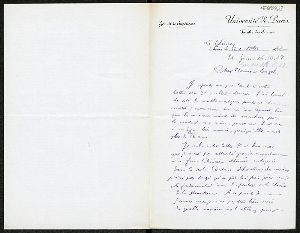 Brief von Élie Cartan an Friedrich Engel vom 22.10.1927