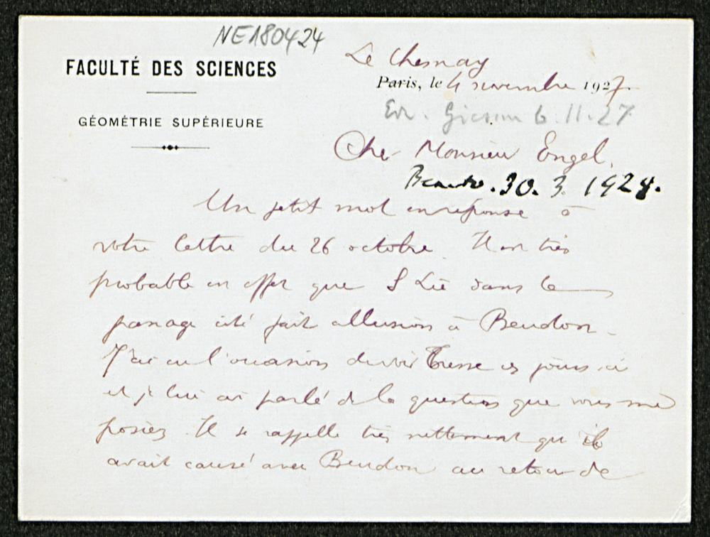 Postkarte von Élie Cartan an Friedrich Engel vom 4.11.1927